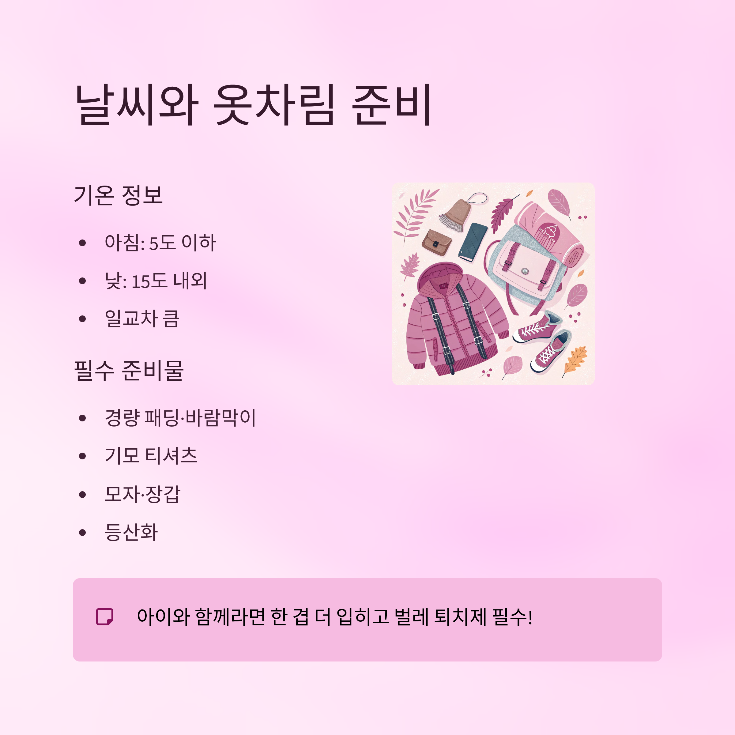 10월의 설악산은 기온 차가 큰 편이에요. 아침엔 5도 이하로 떨어지고, 낮에는 15도 내외까지 올라가죠. 그래서 옷차림은 레이어드가 핵심이에요. 보온성과 활동성을 모두 챙겨야 해요 🧣