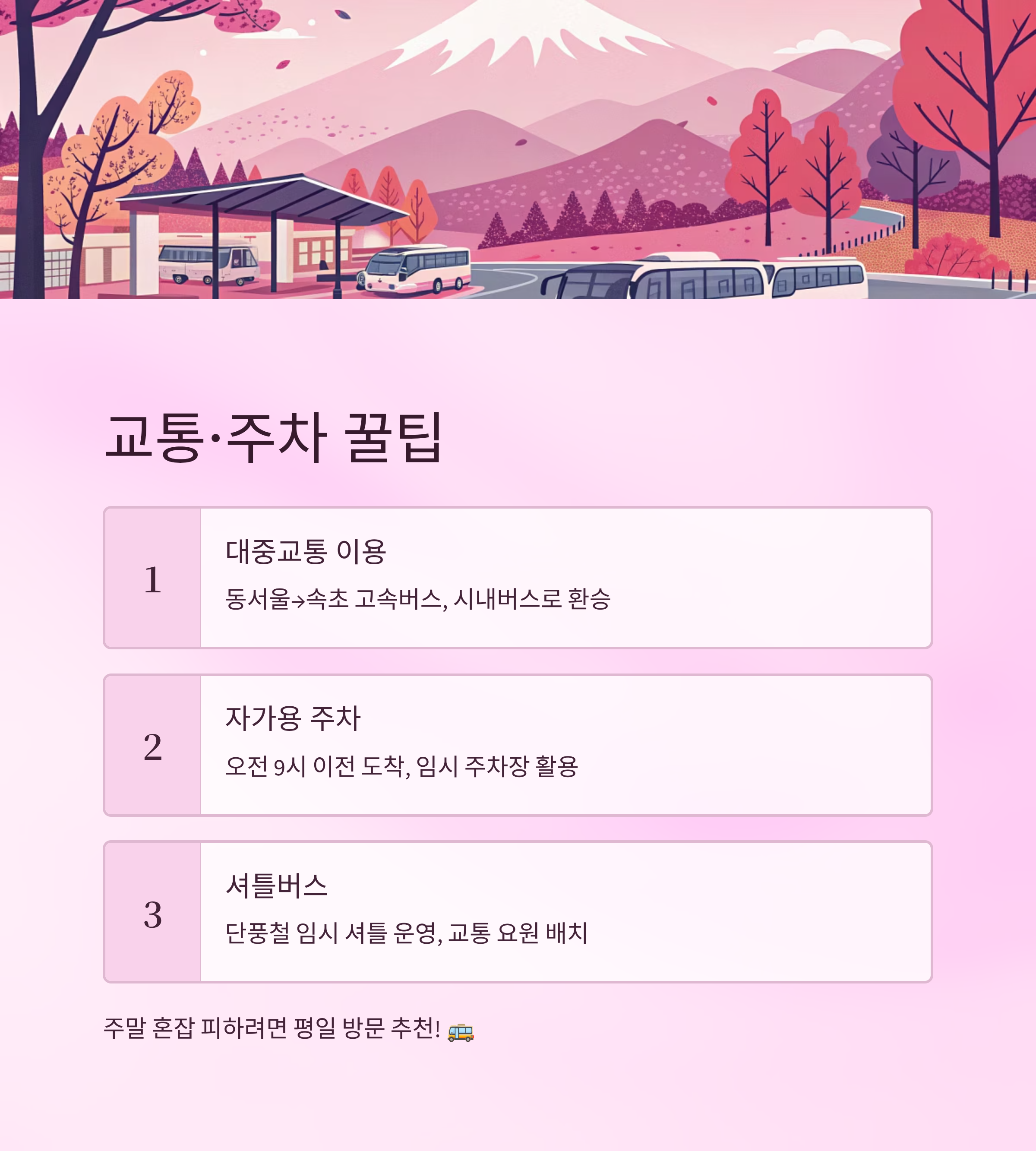 또한, 설악산 국립공원 측에서 단풍 시즌에 맞춰 교통 안내 요원과 임시 표지판을 운영하니 안전하게 이동하세요. 차량보단 도보와 대중교통이 단풍을 더 여유 있게 즐길 수 있는 방법이에요 🌿