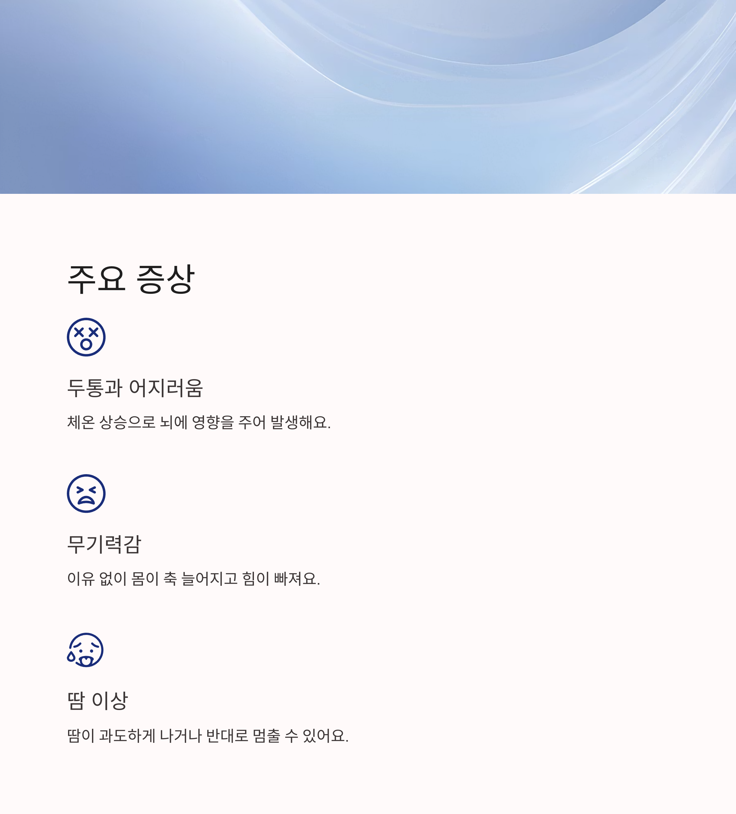 그 다음은 두통과 어지러움이에요. 몸의 열이 빠져나가지 못해 체온이 상승하면 뇌에도 영향을 주게 되죠. 이럴 때는 눈앞이 흐릿해지거나, 귀가 먹먹하고, 메스꺼움을 느낄 수 있어요. 특히 앉았다가 일어날 때 어지럼증이 심하게 느껴지면 주의가 필요해요.