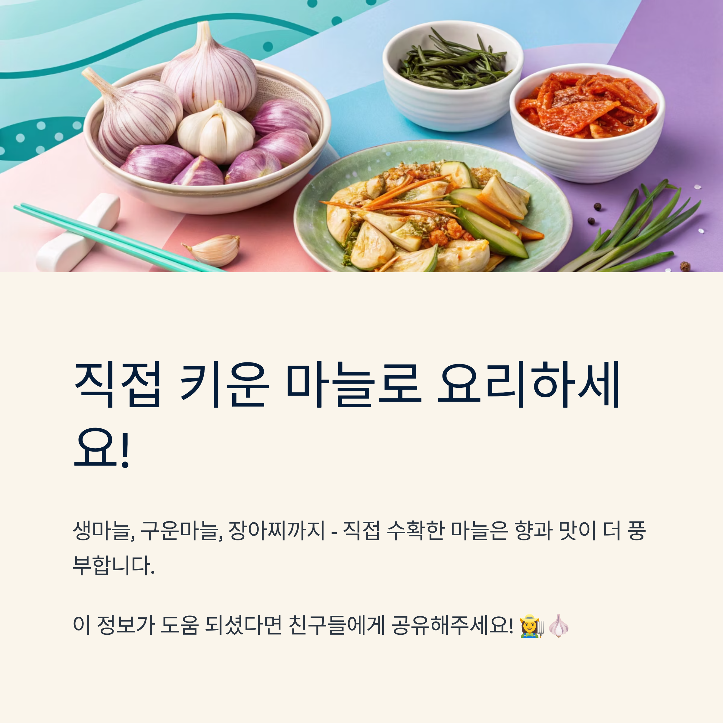 여름철에는 생마늘을 시원한 소스나 샐러드에 썰어 넣고, 겨울에는 장아찌로 담아도 정말 맛있어요. 마늘을 직접 재배해서 먹으면 건강에도 좋고, 요리도 더 다채로워진답니다!