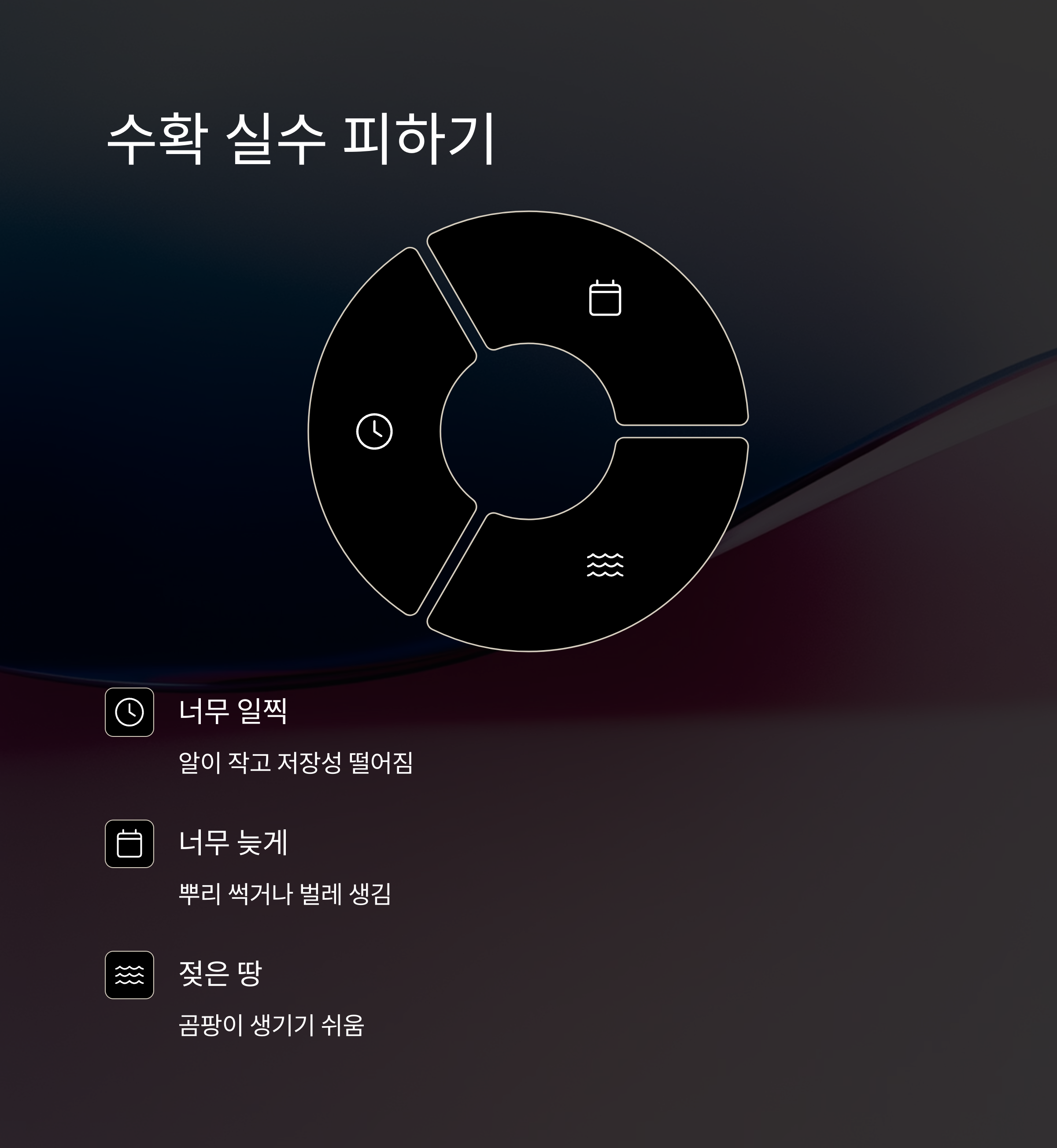 | 너무 빨리 수확 | 알 작고, 저장성 저하 | 잎 상태 체크 |