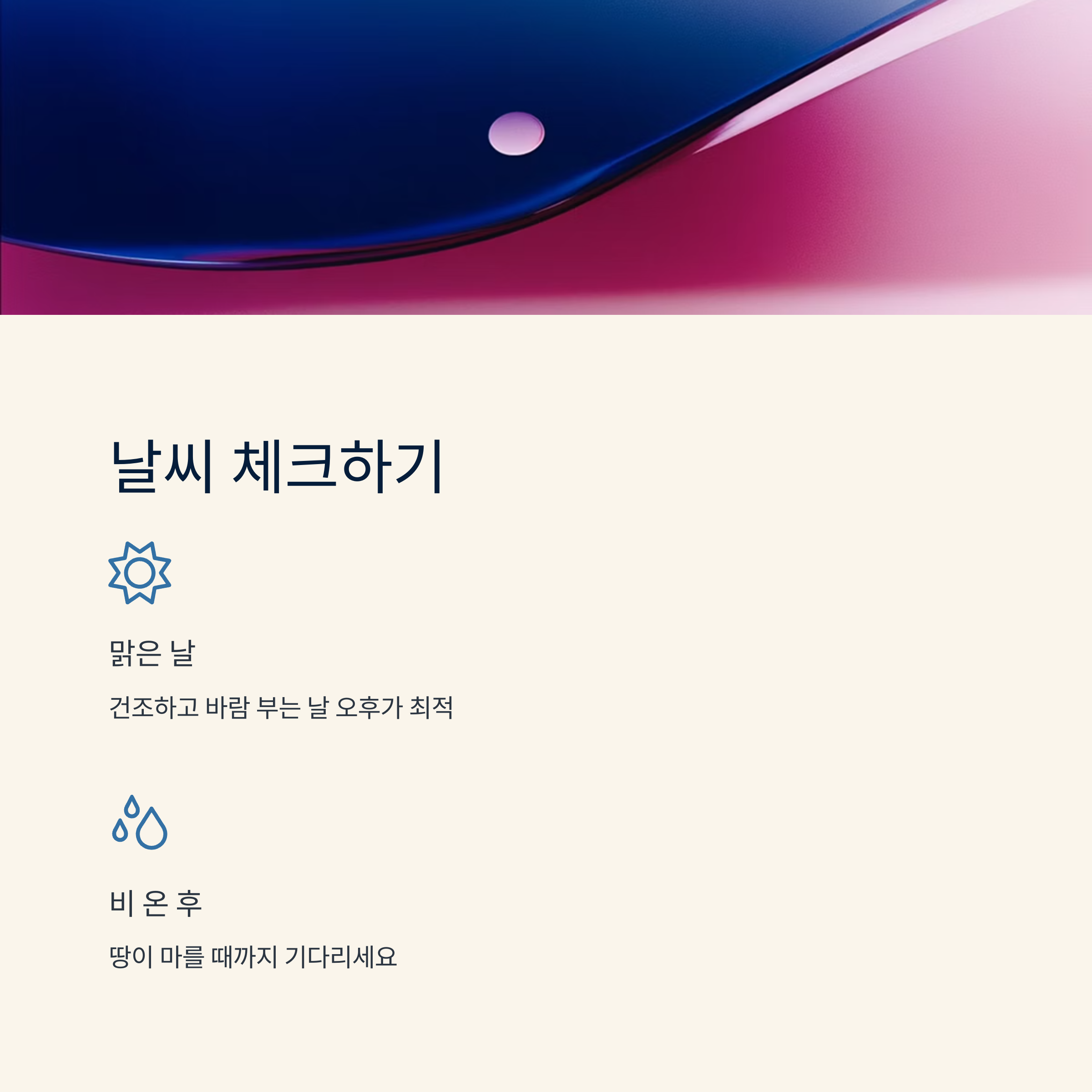 가장 좋은 날씨는 맑고 바람이 잘 부는 건조한 날 오후예요. 땅이 푹신하지 않고 살짝 단단한 느낌이 들 때 캐야 마늘이 껍질도 예쁘게 유지되고, 흙도 적게 붙어서 보관하기 훨씬 좋아진답니다.