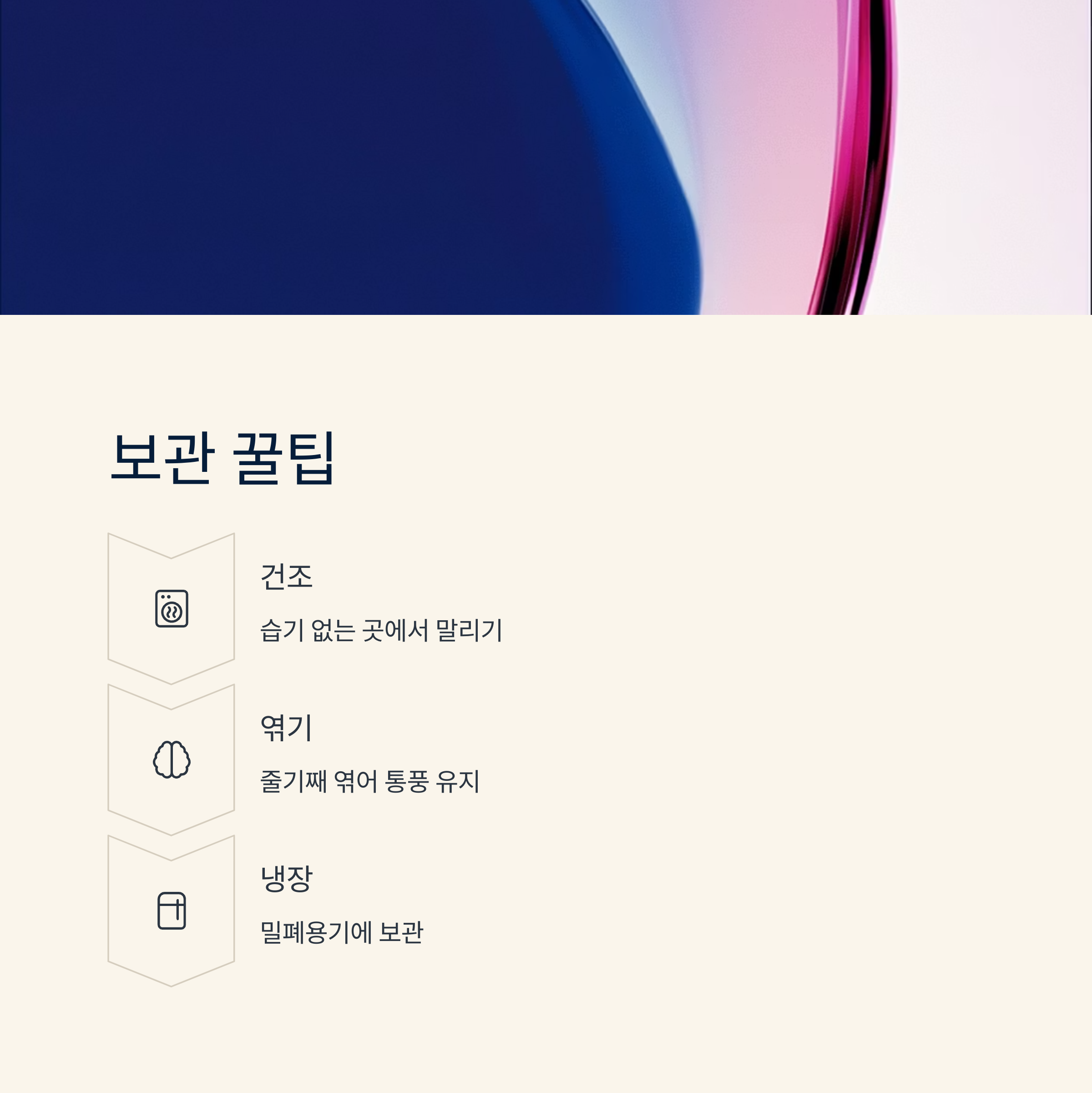 A7. 충분히 말려서 보관하면 오래 쓸 수 있어요. 단, 곰팡이나 물러짐만 수시로 체크하세요!