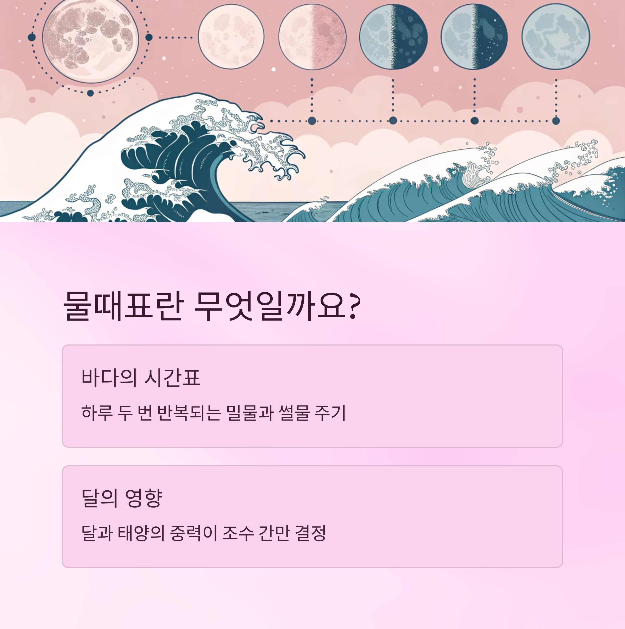 물때는 달과 태양의 중력에 의해 결정돼요. 특히 달의 영향력이 커서 음력 기준으로 강한 조수 간만이 나타나는 날이 있죠. 이 날을 ‘사리’라고 부르고, 반대로 물이 가장 약한 날은 ‘좀’이라고 해요. 이 흐름을 정확하게 보기 위해 사용하는 게 바로 물때표랍니다.