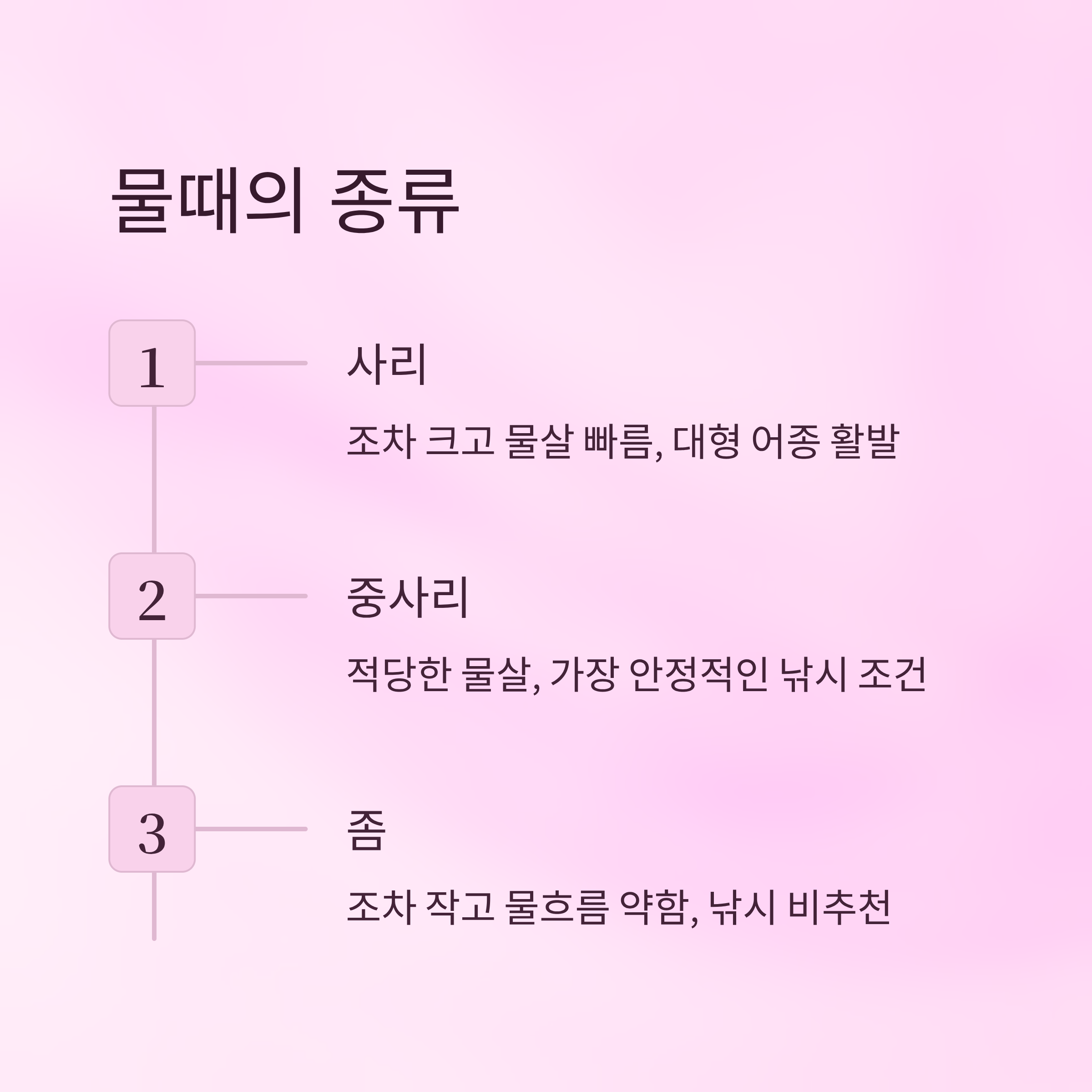 | 좀물 | 조차 작음, 물흐름 약함 | 낚시 비추천 시기 |