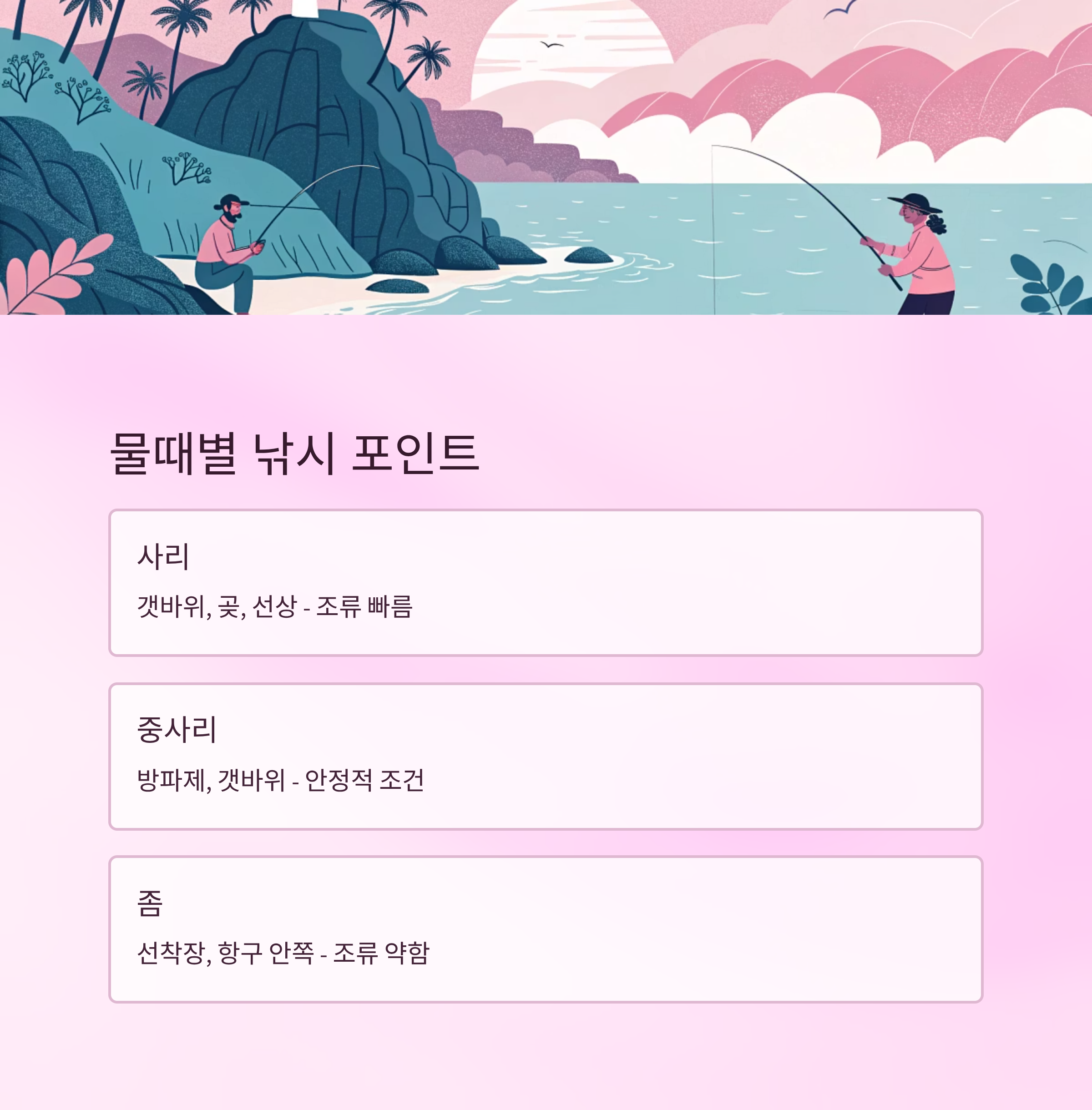 물때에 따라 낚시 포인트도 달라져야 해요. 아무리 좋은 장비를 갖췄더라도, 물때와 포인트가 맞지 않으면 입질 받기 어려워요. 특히 조류가 강한 날은 갯바위, 방파제 끝자락, 조류 소통이 활발한 곶 부분이 유리하답니다.