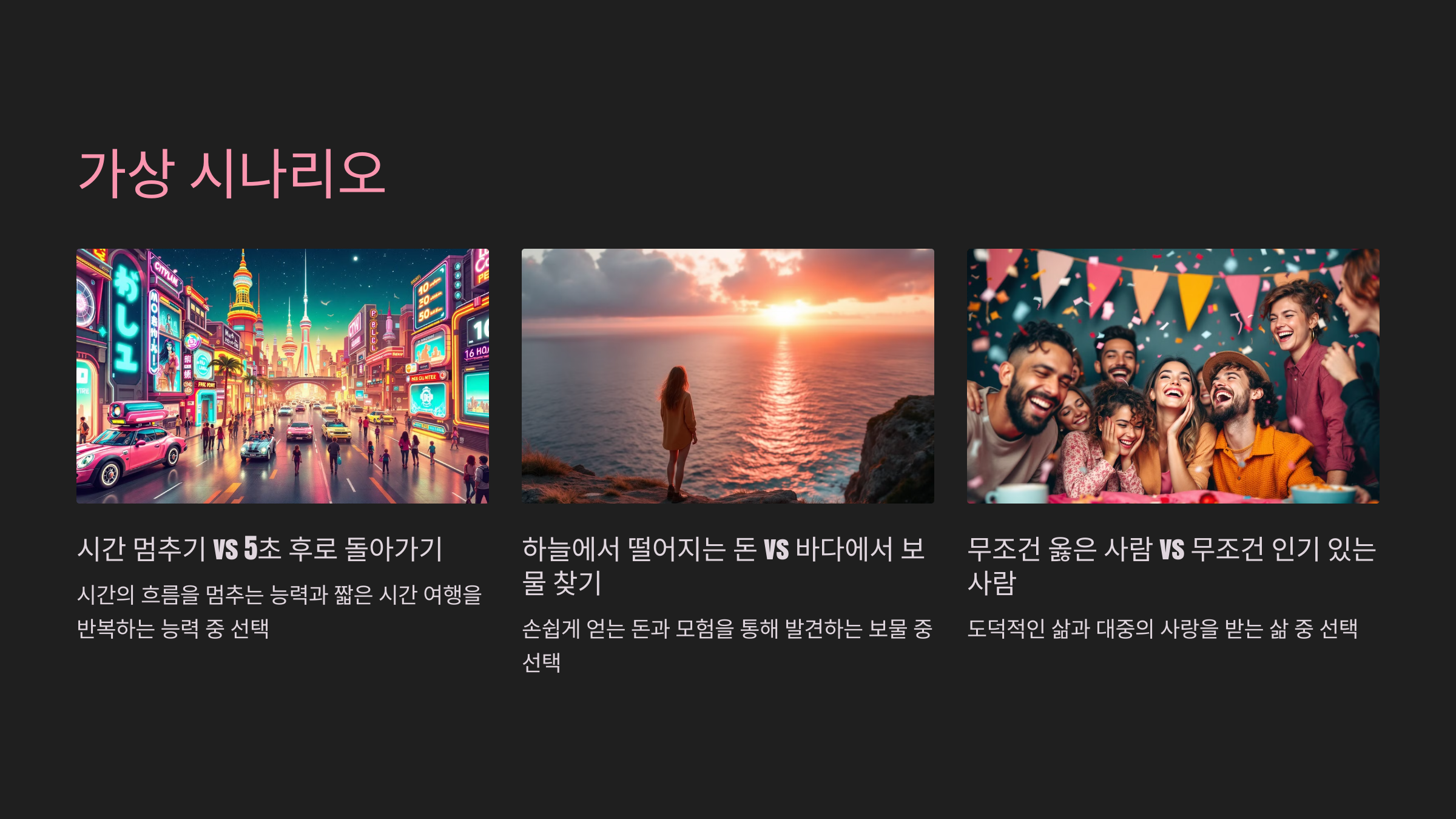 - 초자연적인 힘을 가지고 세상을 바꿀 기회와, 무한한 부를 통해 영향력을 행사할 기회 중 당신은 무엇을 선택하시겠습니까?