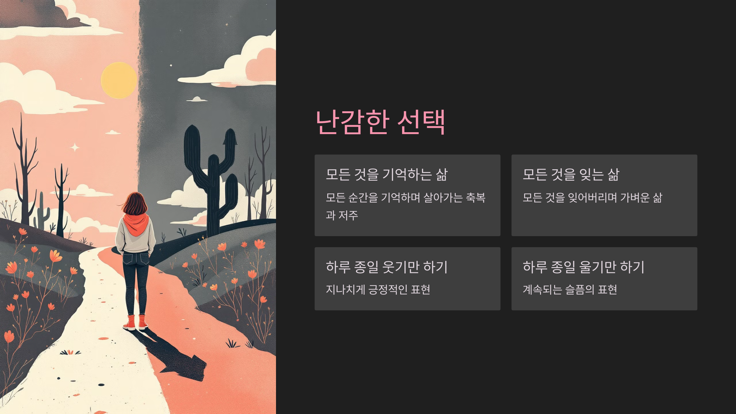 - 모든 순간을 기억하며 살아가는 축복과 저주, 또는 모든 것을 잊어버리며 가벼운 삶. 어떤 삶이 더 나은 선택일까요?