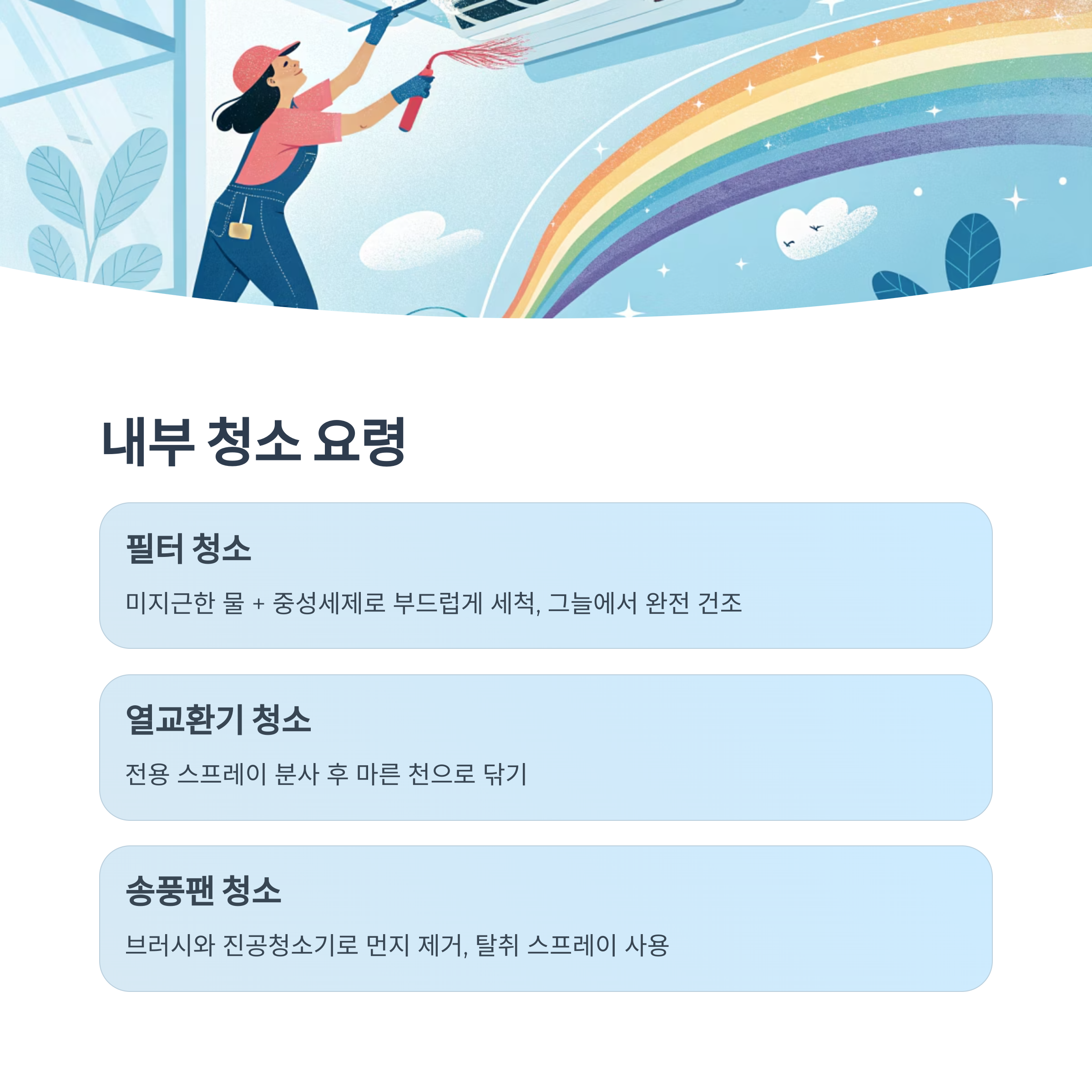 | 송풍팬 | 브러시, 진공청소기 | 먼지 제거 후 탈취 스프레이 사용 |