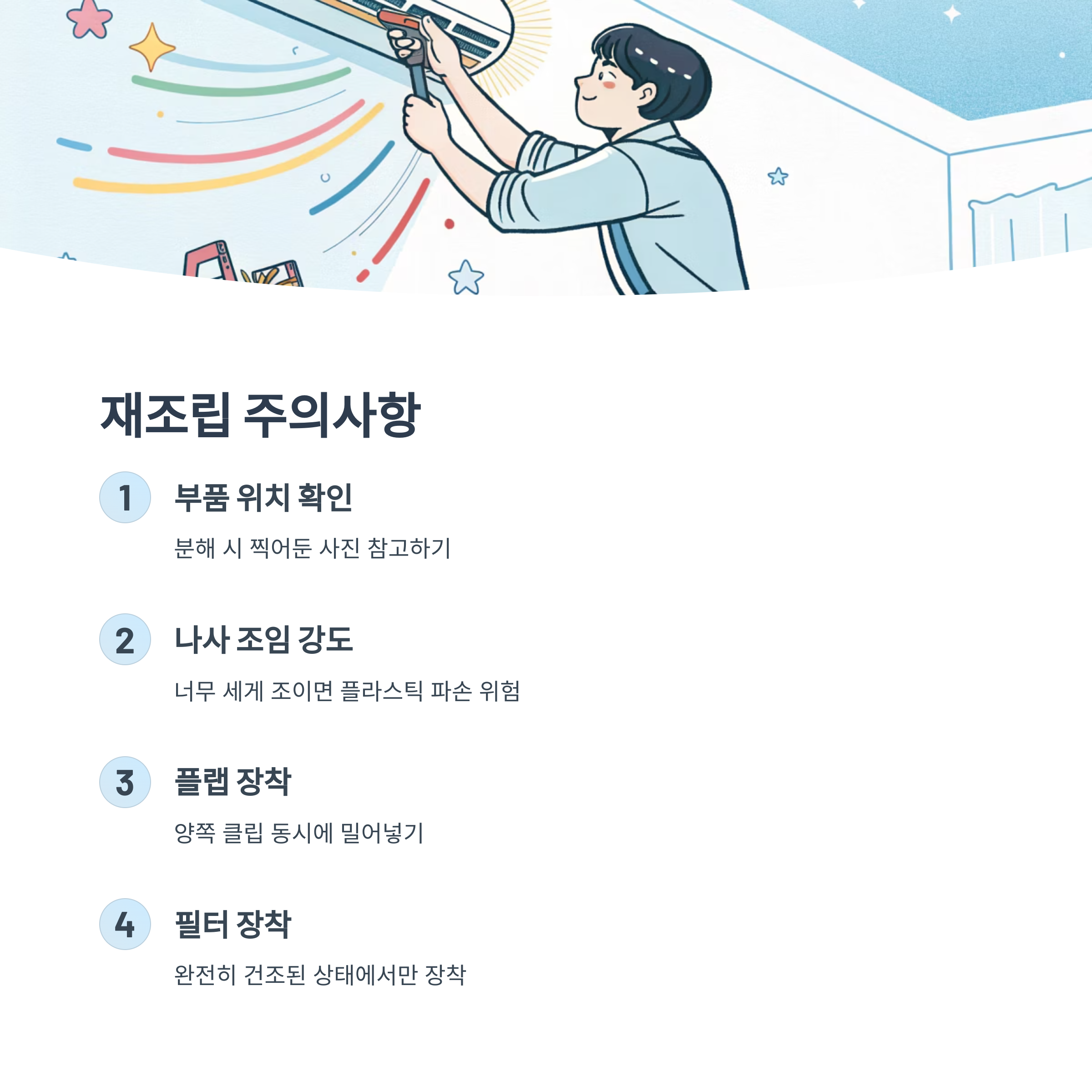이제 분해와 청소, 그리고 조립까지 모두 마쳤다면 뿌듯함이 느껴질 거예요! 다음은 에어컨 분해 시 꼭 알아야 할 주의사항을 정리해볼게요.