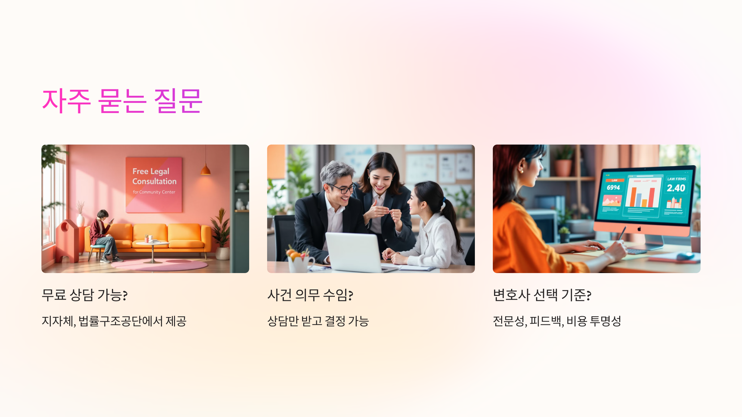 A1. 아닙니다. 일부 지자체, 대한법률구조공단, 주민센터에서는 무료 상담도 제공하고 있어요. 다만 복잡한 사안은 유료 상담이 더 정확한 판단을 도와줘요.