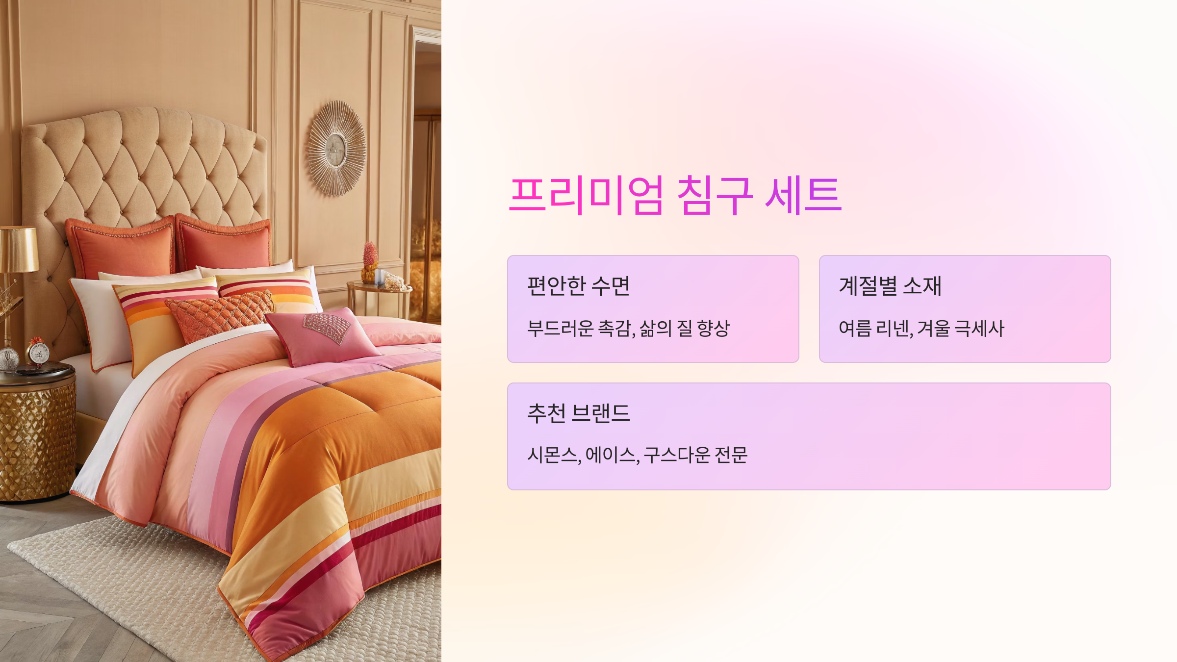 특히 여름에는 땀 흡수가 잘 되는 리넨 소재, 겨울에는 따뜻한 극세사 소재 제품을 추천해요. 브랜드로는 시몬스, 에이스, 구스다운 전문 브랜드도 인기랍니다!