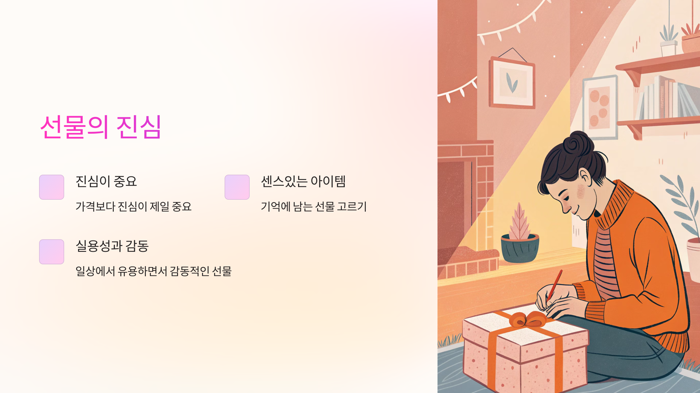 제가 생각했을 때, 부모님 선물은 가격보다는 진심이 제일 중요해요. 하지만 그래도 센스 있는 아이템이라면 더 기억에 남겠죠? 실용성도 챙기고 감동도 전할 수 있는 다양한 선물 리스트를 소개할게요!