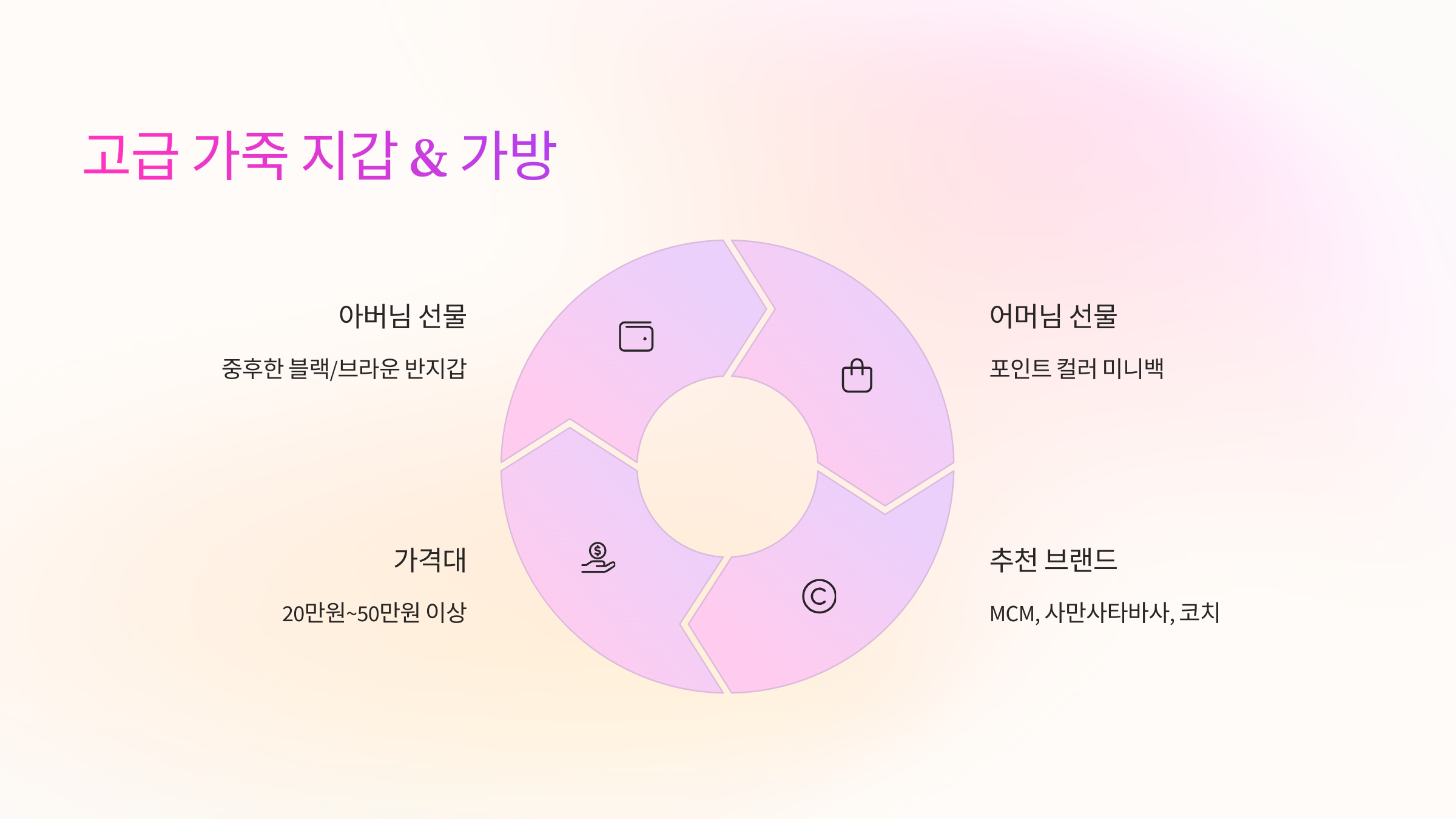 특히 아버님께는 중후한 블랙이나 브라운 컬러의 반지갑, 어머님께는 포인트 컬러가 들어간 미니백이 인기 많아요. 국내 브랜드로는 MCM, 사만사타바사, 코치도 좋아요.