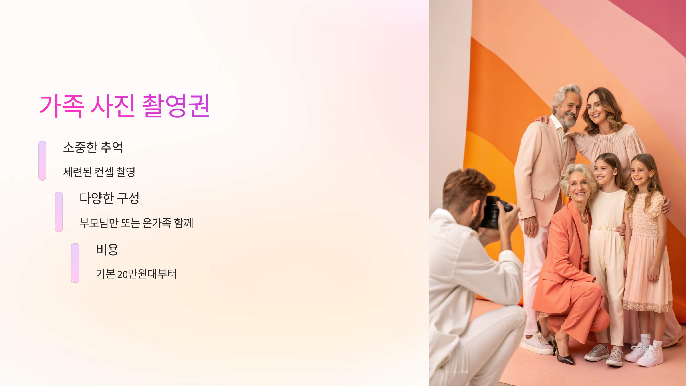 부모님과 함께하는 가족 사진, 정말 소중한 추억이 되죠! 요즘은 가족사진 스튜디오도 세련된 인테리어와 컨셉 촬영을 제공해서 만족도가 매우 높아요.