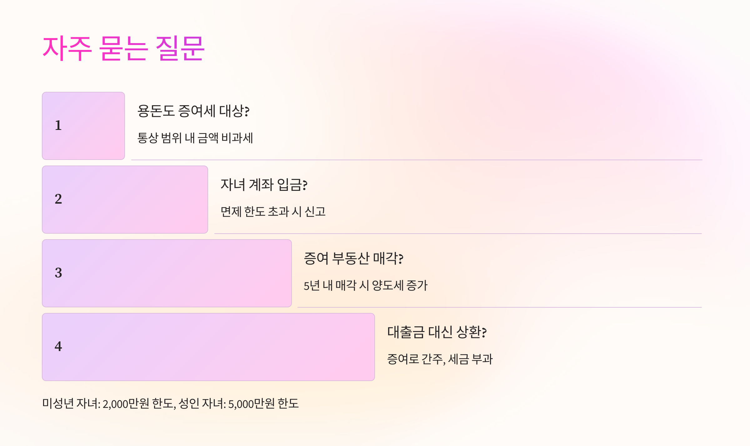 A1. 생활비나 교육비 등 통상적인 범위 내의 금액이라면 증여세가 부과되지 않아요. 하지만 고액의 용돈을 정기적으로 주면 증여로 간주될 수 있어요.