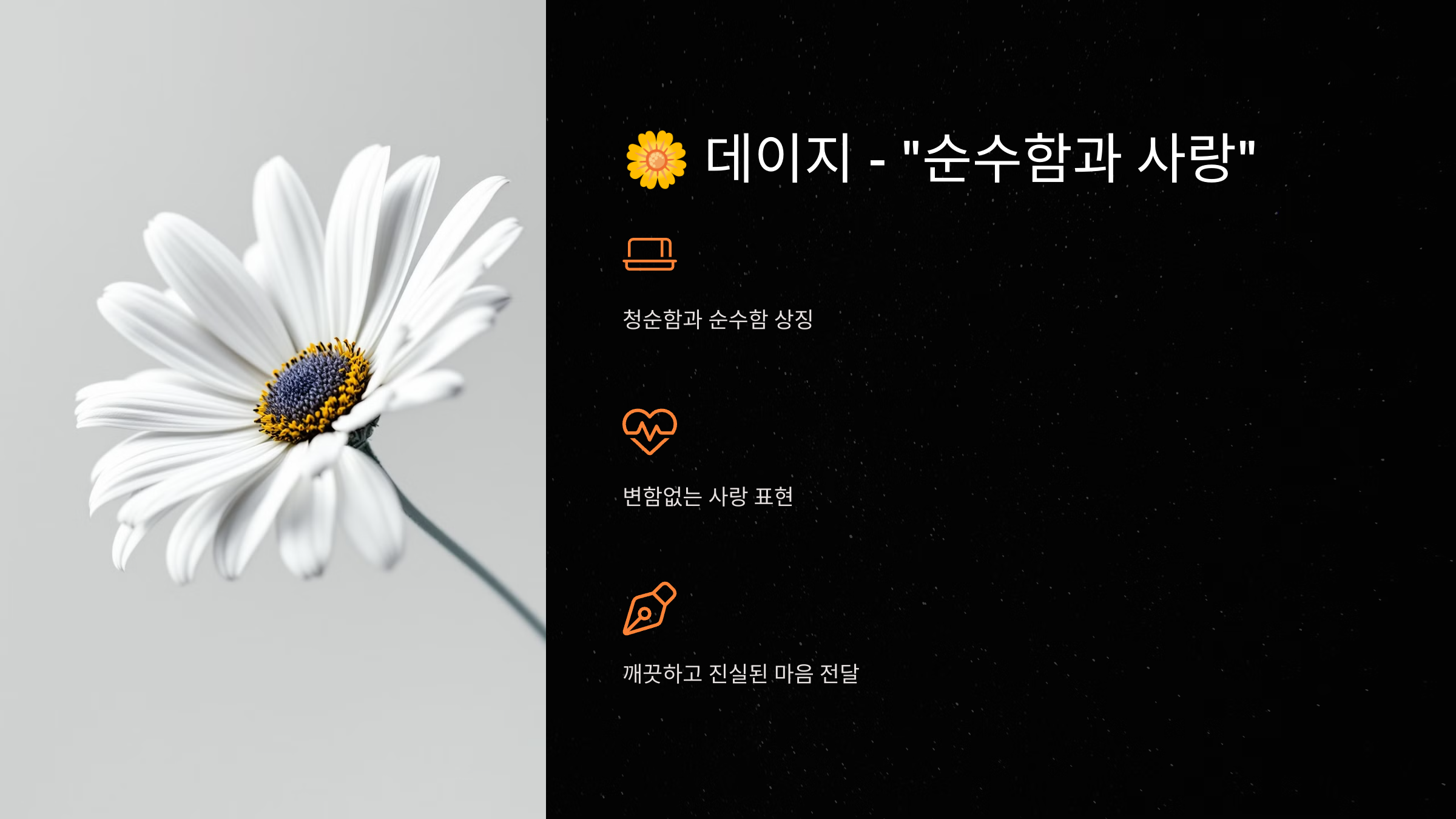 데이지는 청순함과 순수함을 상징하며, 상대방에게 변함없는 사랑과 순수한 마음을 전하는 꽃입니다.