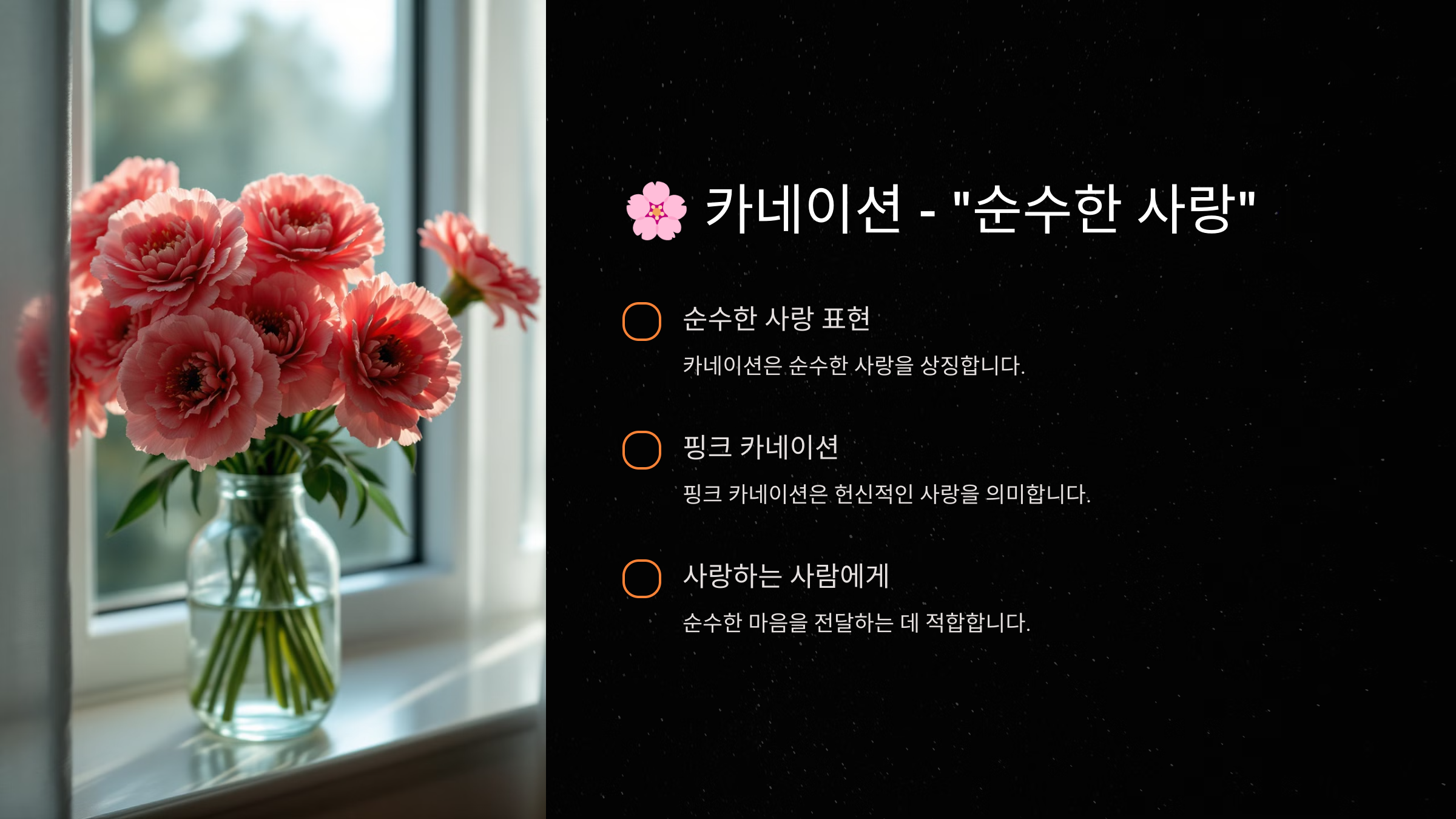 특히 핑크색 카네이션은 순수하고 헌신적인 사랑을 표현합니다.