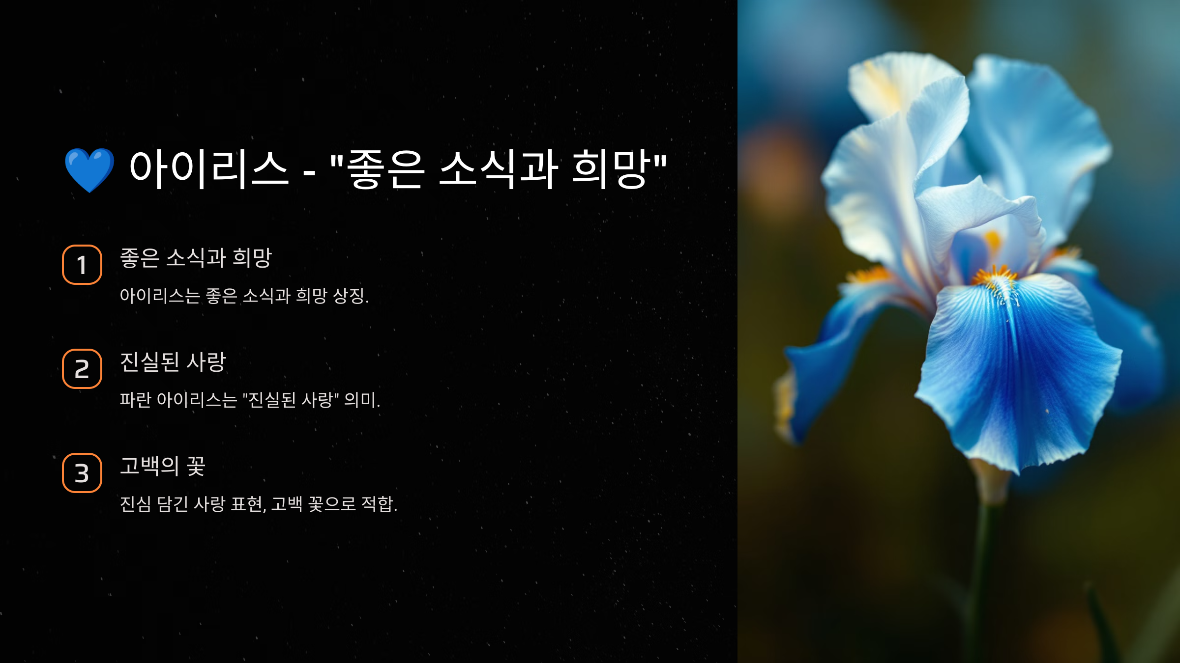 아이리스는 좋은 소식과 희망을 상징하지만, 파란 아이리스는 "진실된 사랑"의 의미를 가집니다.