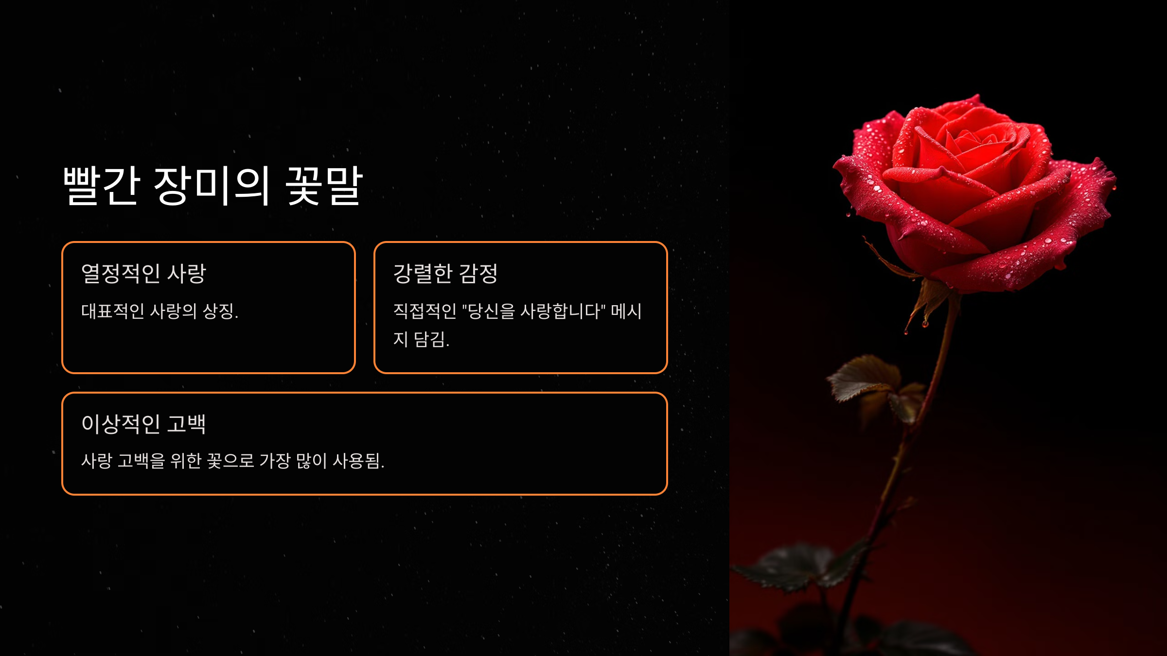 사랑 고백을 위한 꽃으로 가장 많이 쓰이며, 빨간 장미 한 송이에는 "당신을 사랑합니다"라는 직접적인 메시지가 담겨 있어 고백할 때 이상적입니다.