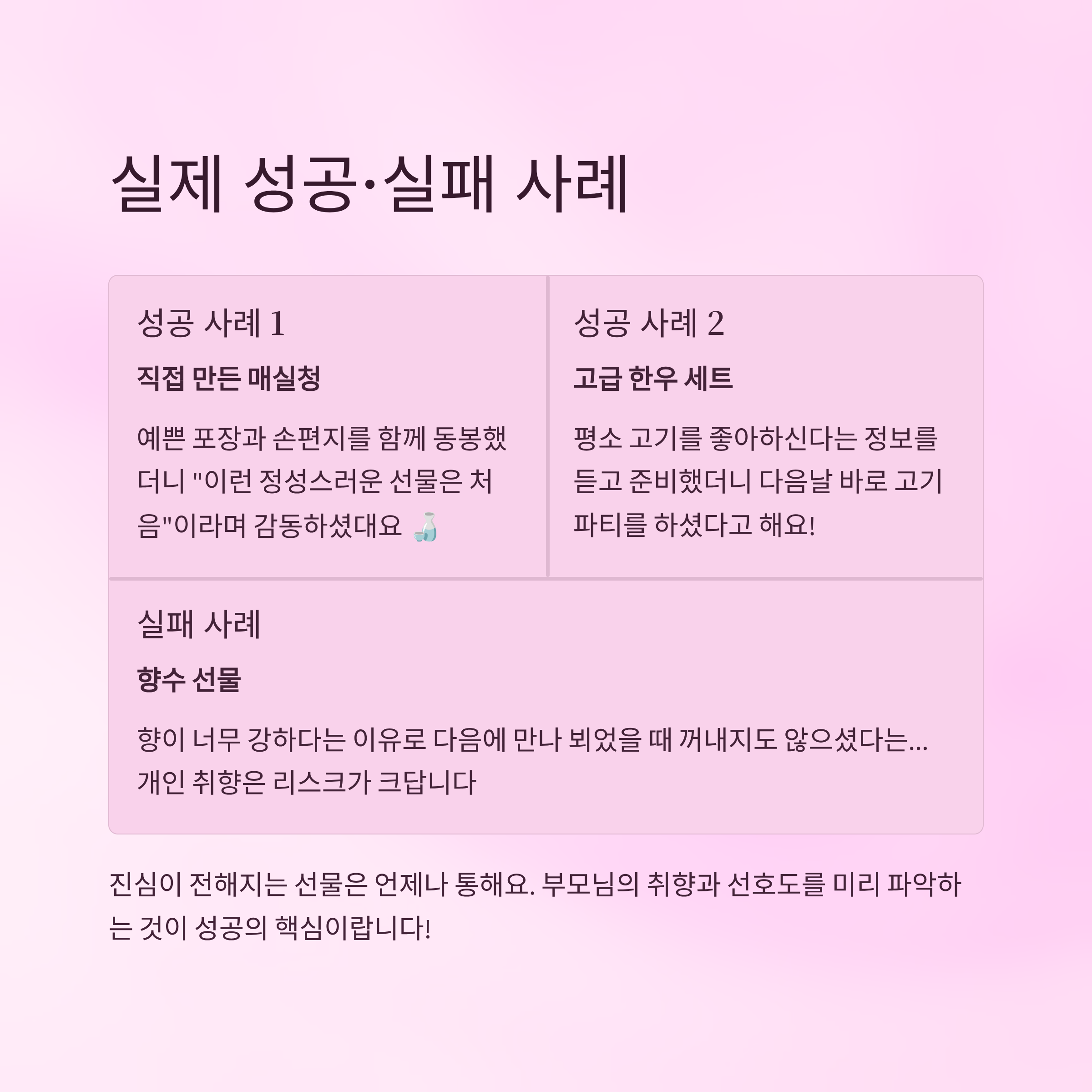 하지만 실패 사례도 있었어요. 향수를 선물했는데 향이 너무 강하다는 이유로 다음에 만나 뵈었을 때 꺼내지도 않으셨다는... 개인적인 취향이 들어간 선물은 그만큼 리스크도 크답니다!