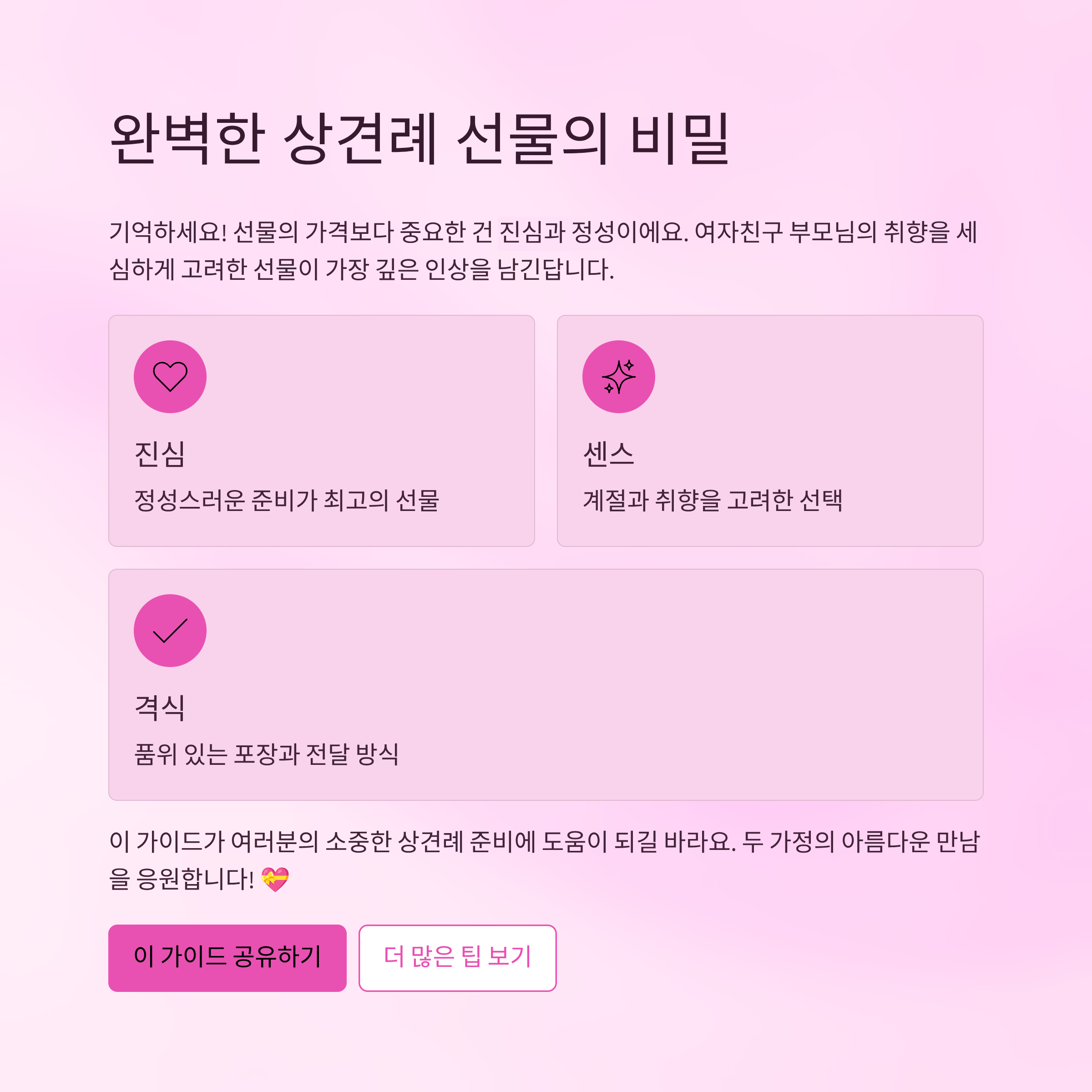 상견례는 결혼을 앞두고 양가 부모님이 처음 만나 교류하는 자리예요. 이때 주고받는 선물은 단순한 물건이 아니라 상대에 대한 예의와 배려를 담는 상징적인 행위랍니다. 여자친구 부모님께 드릴 상견례 선물을 고를 때는 실용성, 품격, 진심 이 세 가지를 꼭 고려해야 해요.