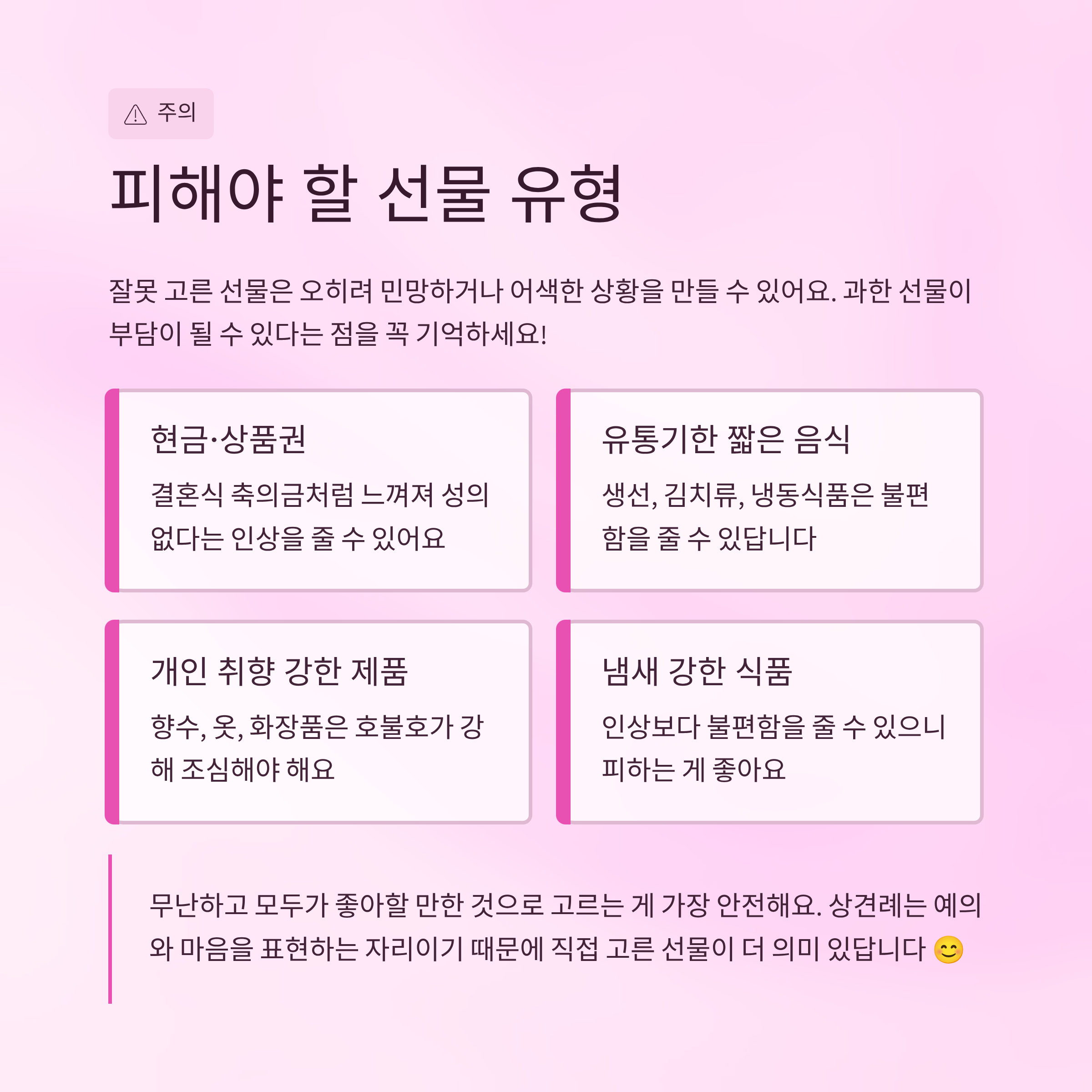 선물이 항상 좋은 인상을 주는 건 아니에요. 오히려 잘못 고르면 민망하거나 어색한 상황이 생기기도 하죠. 특히 상견례 자리에서는 ‘무조건 고급이면 좋다’는 오해는 피해야 해요. 때로는 과한 선물이 부담이 될 수 있어요.