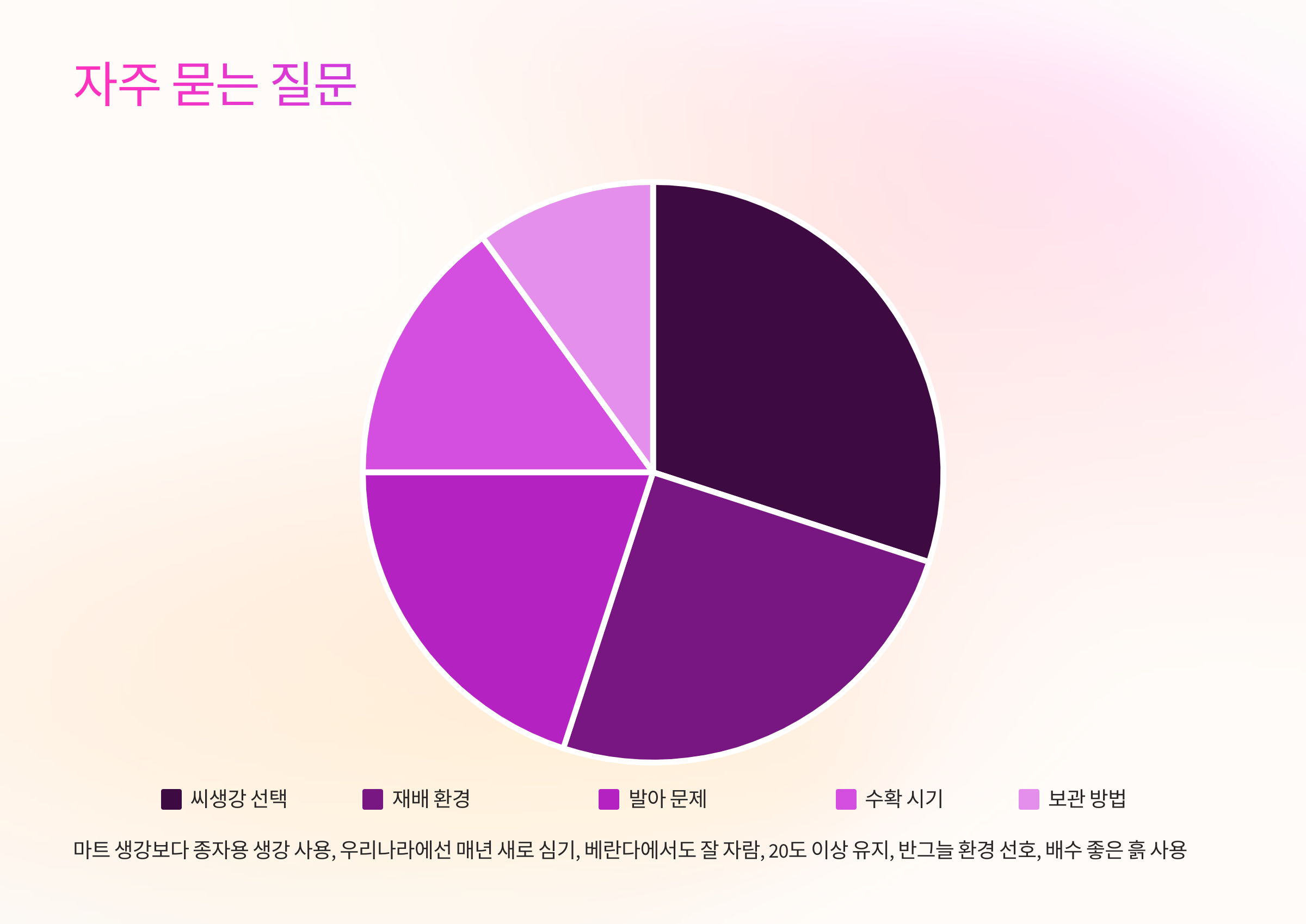 A4. 온도가 낮거나 씨생강 상태가 좋지 않으면 발아하지 않을 수 있어요. 온도를 20도 이상 유지해주세요.