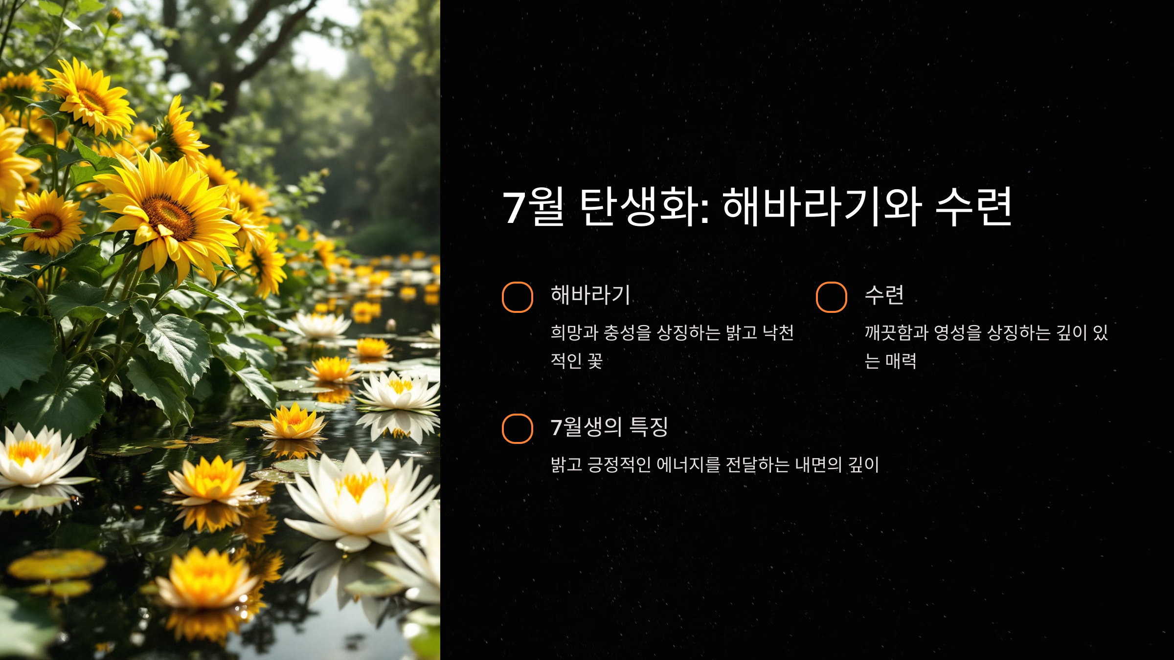 7월생의 특징: 밝고 긍정적인 에너지를 주변에 전달하며, 내면의 깊이가 있는 사람입니다.