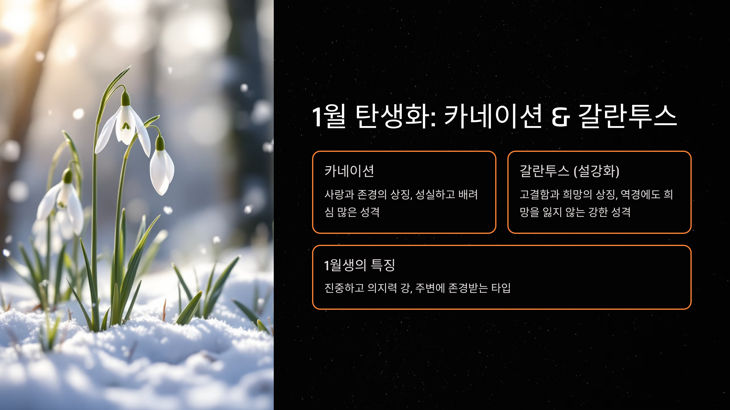 1월생의 특징: 진중하고 의지력이 강하며, 주변 사람들에게 존경받는 타입이에요.