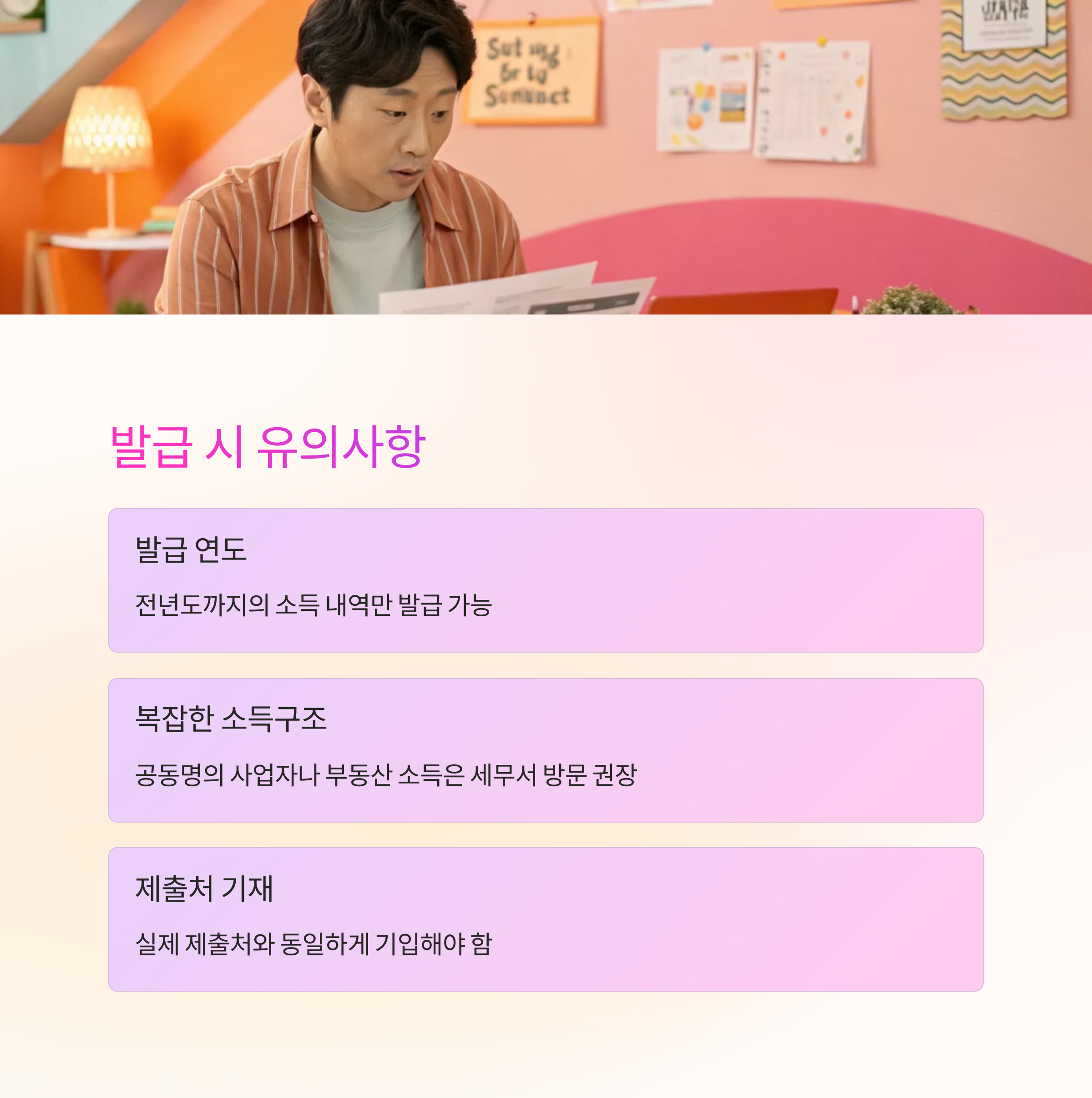 소득금액증명서를 발급받을 때는 몇 가지 꼭 알아둬야 할 유의사항이 있어요. 잘못 발급되거나 원하는 정보가 누락되면 제출처에서 인정받지 못하는 상황이 생길 수도 있거든요.