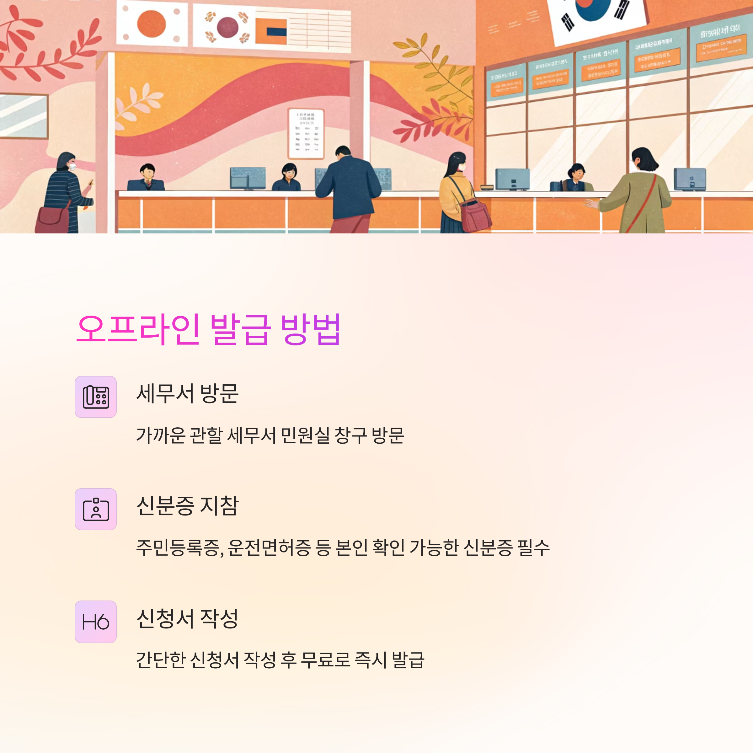 온라인 사용이 익숙하지 않거나, 프린터가 없는 분들은 가까운 세무서를 방문해서 직접 발급받는 방법도 있어요. 신분증만 지참하면 어렵지 않답니다.