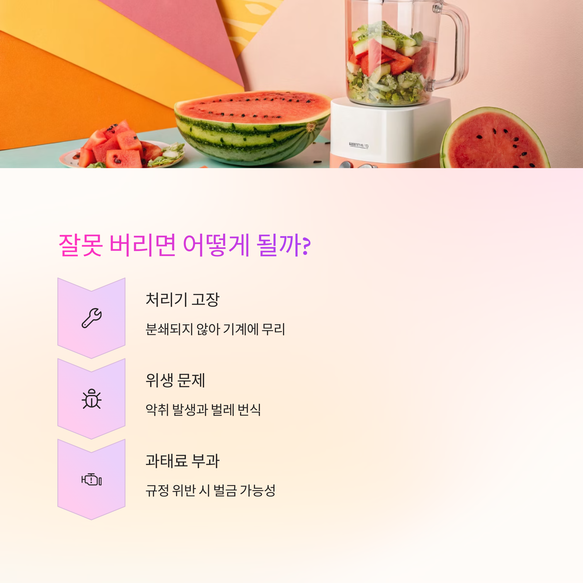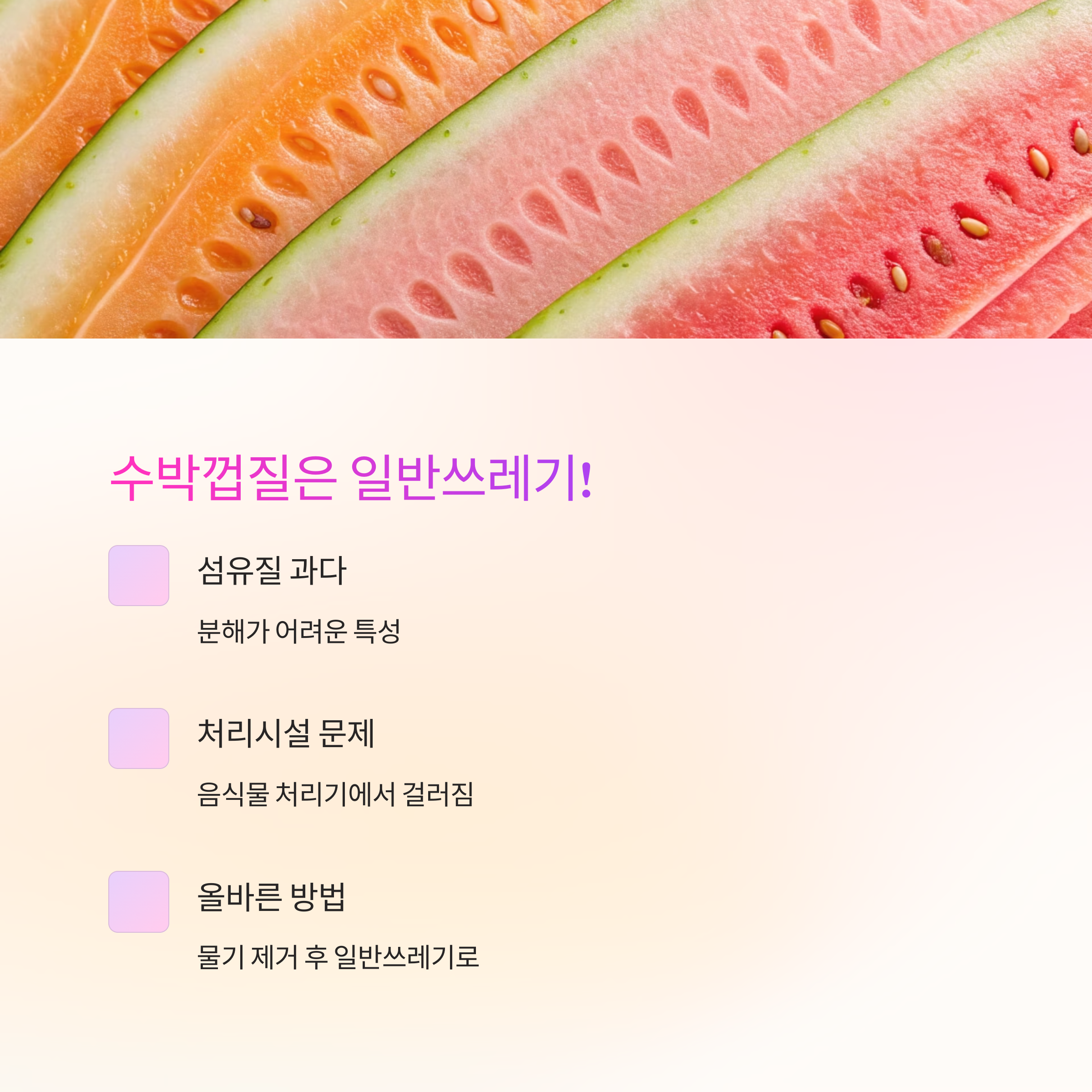 잘못된 배출 하나가 공동주택 전체 주민에게 피해를 줄 수 있으니, 수박껍질 하나라도 정확히 배출하는 습관을 들이면 좋겠죠? 😊