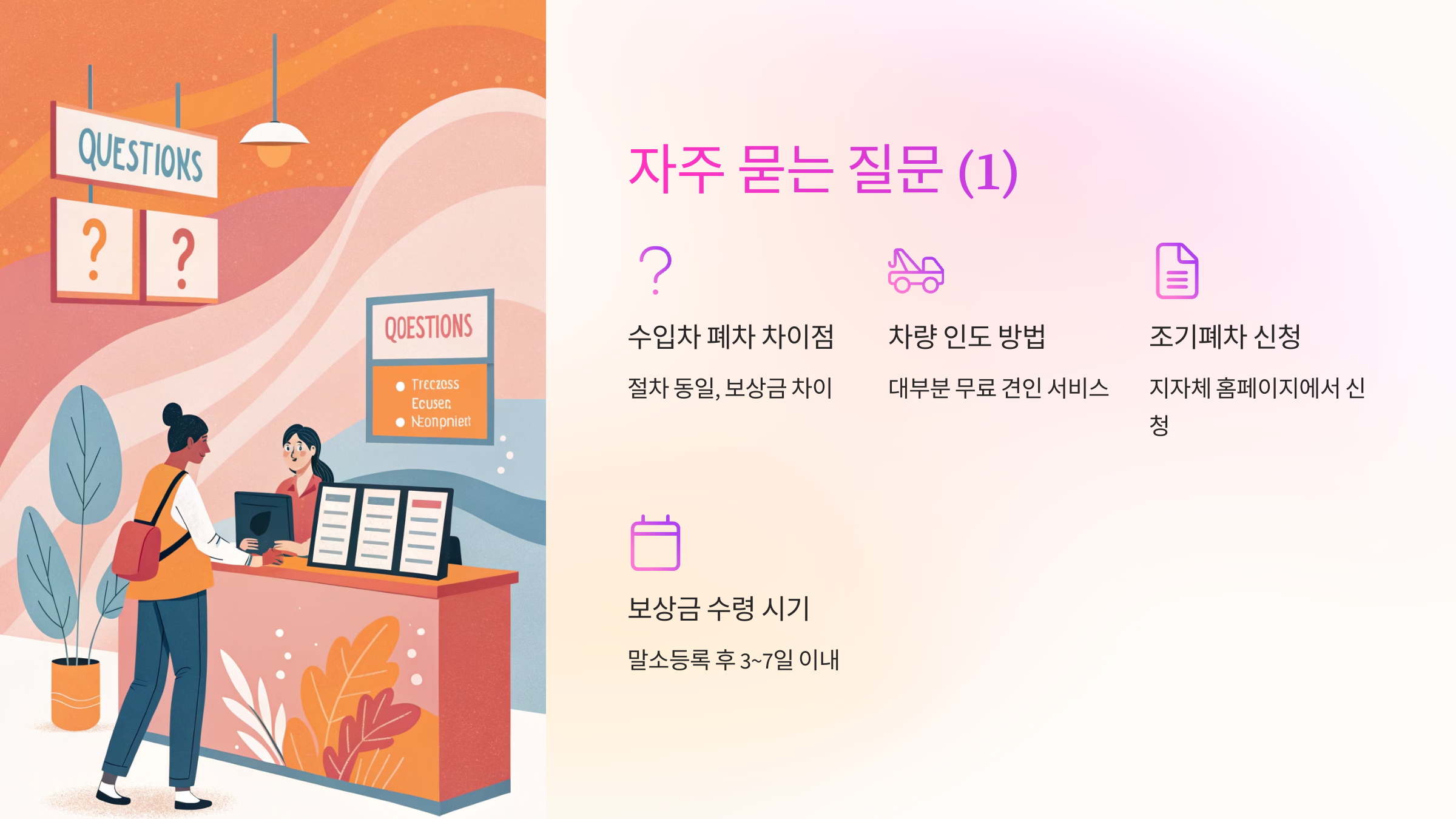A1. 기본적인 폐차 절차는 같지만, 수입차는 부품 가격이나 재활용 가치가 높아 보상금 측면에서 차이가 있어요. 또한 일부 고가 수입차는 특수 부품 때문에 전문 폐차장을 이용해야 할 수도 있어요.