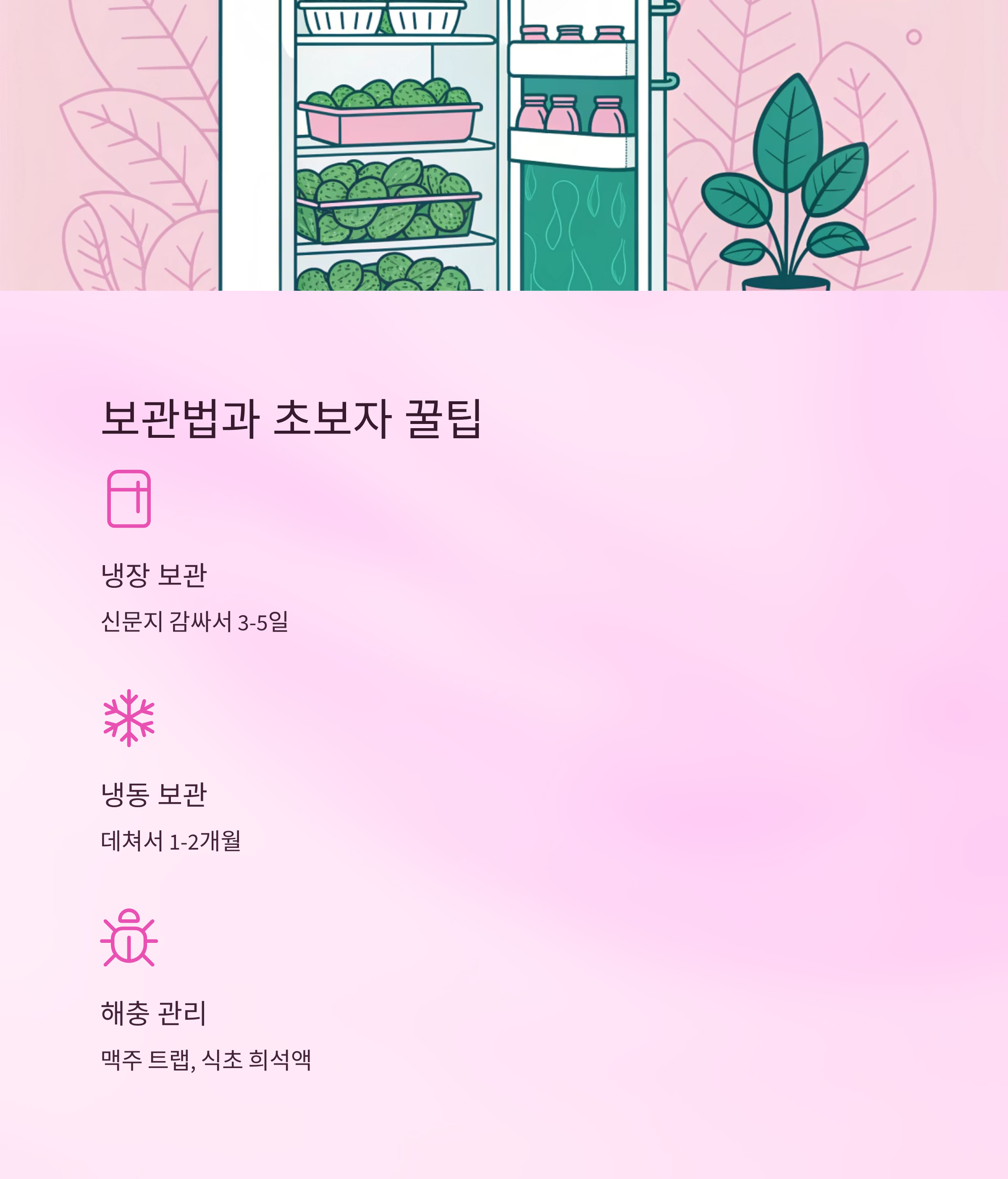 | 냉동 보관 | 데쳐서 소분 냉동 | 장기 보관 가능 | 1~2개월 |