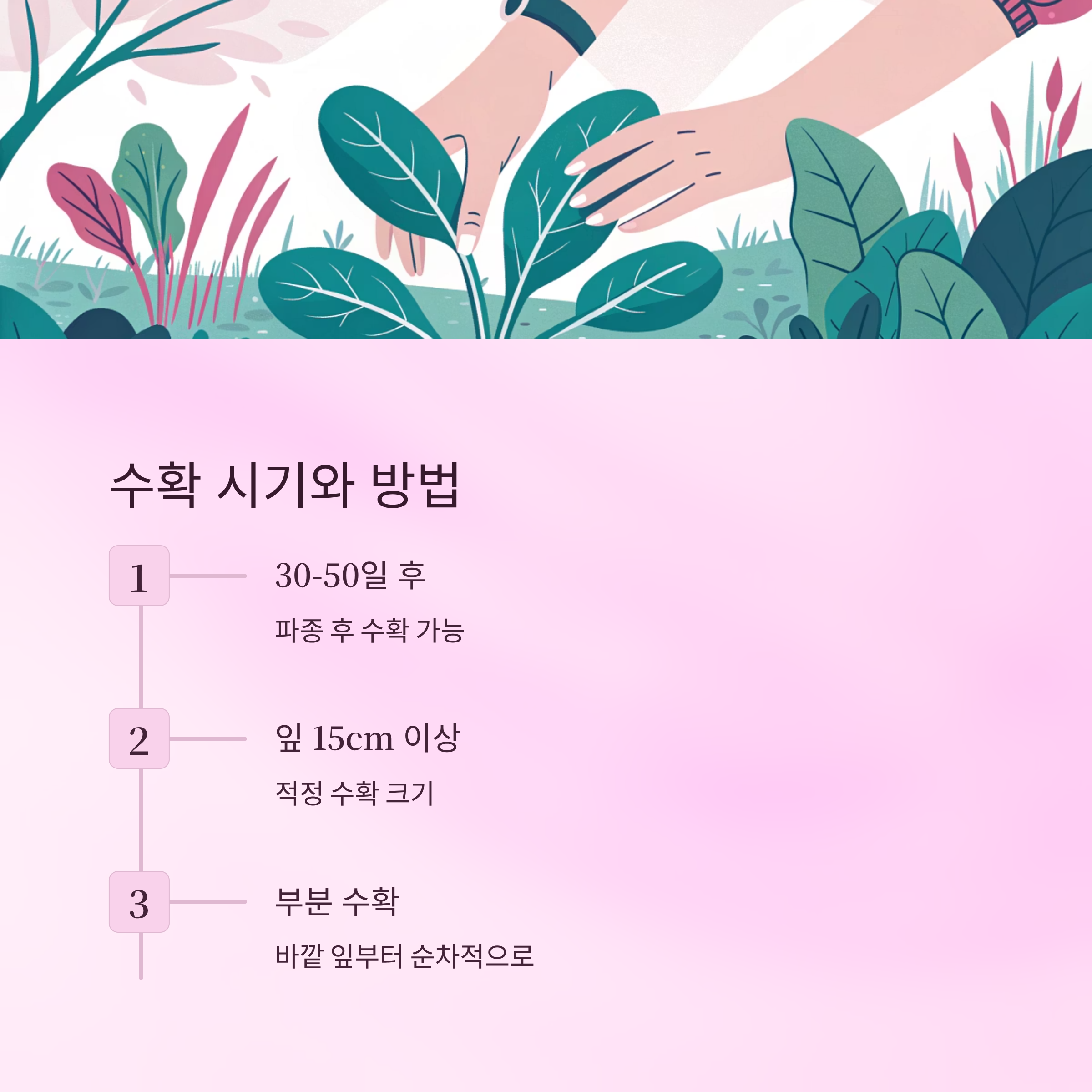 | 부분 수확 | 바깥 잎부터 순차적으로 수확 | 오랫동안 지속 수확 가능 | 즉시 섭취 권장 |