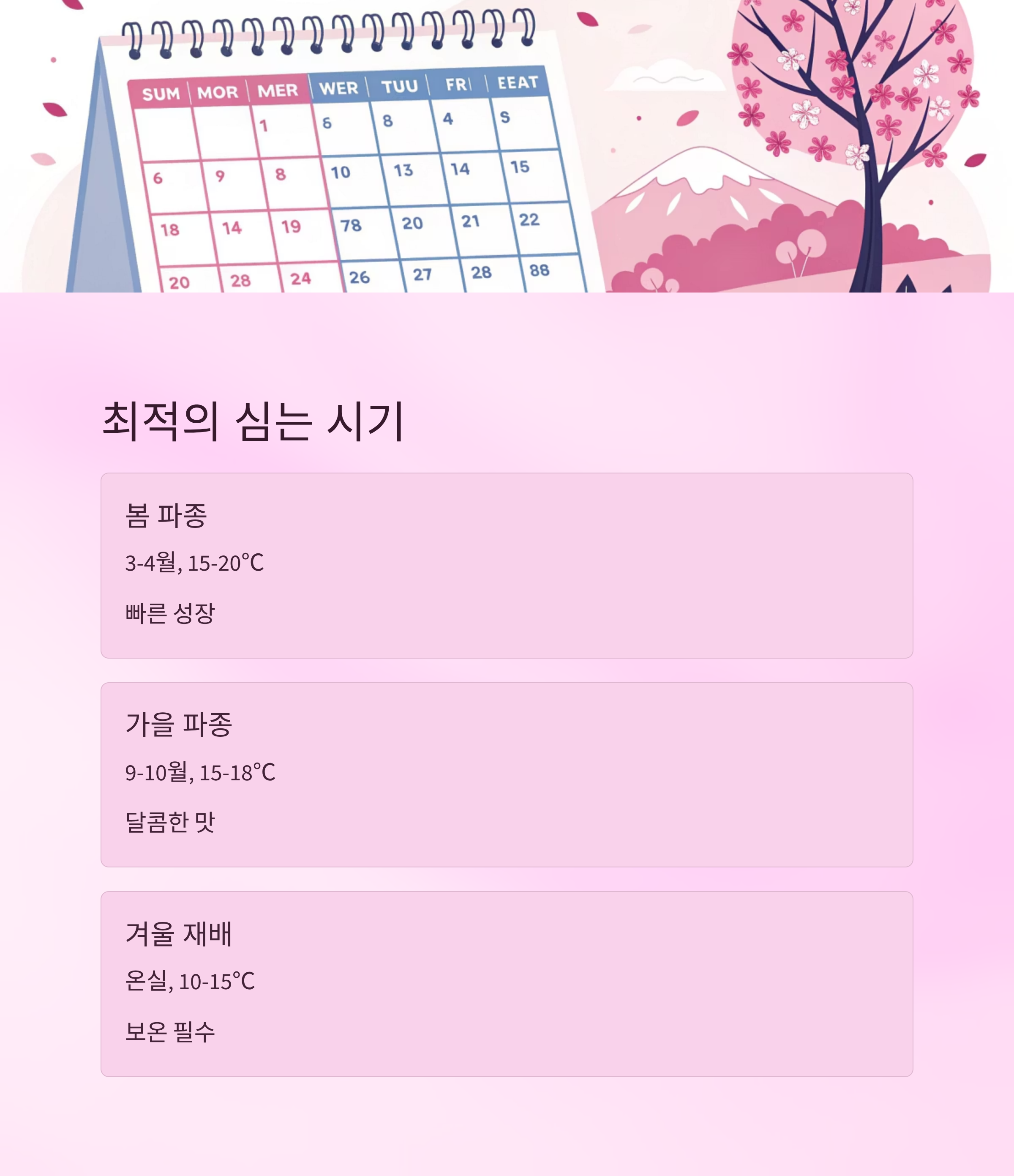 | 파종 시기 | 기온 조건 | 장점 | 주의점 |
