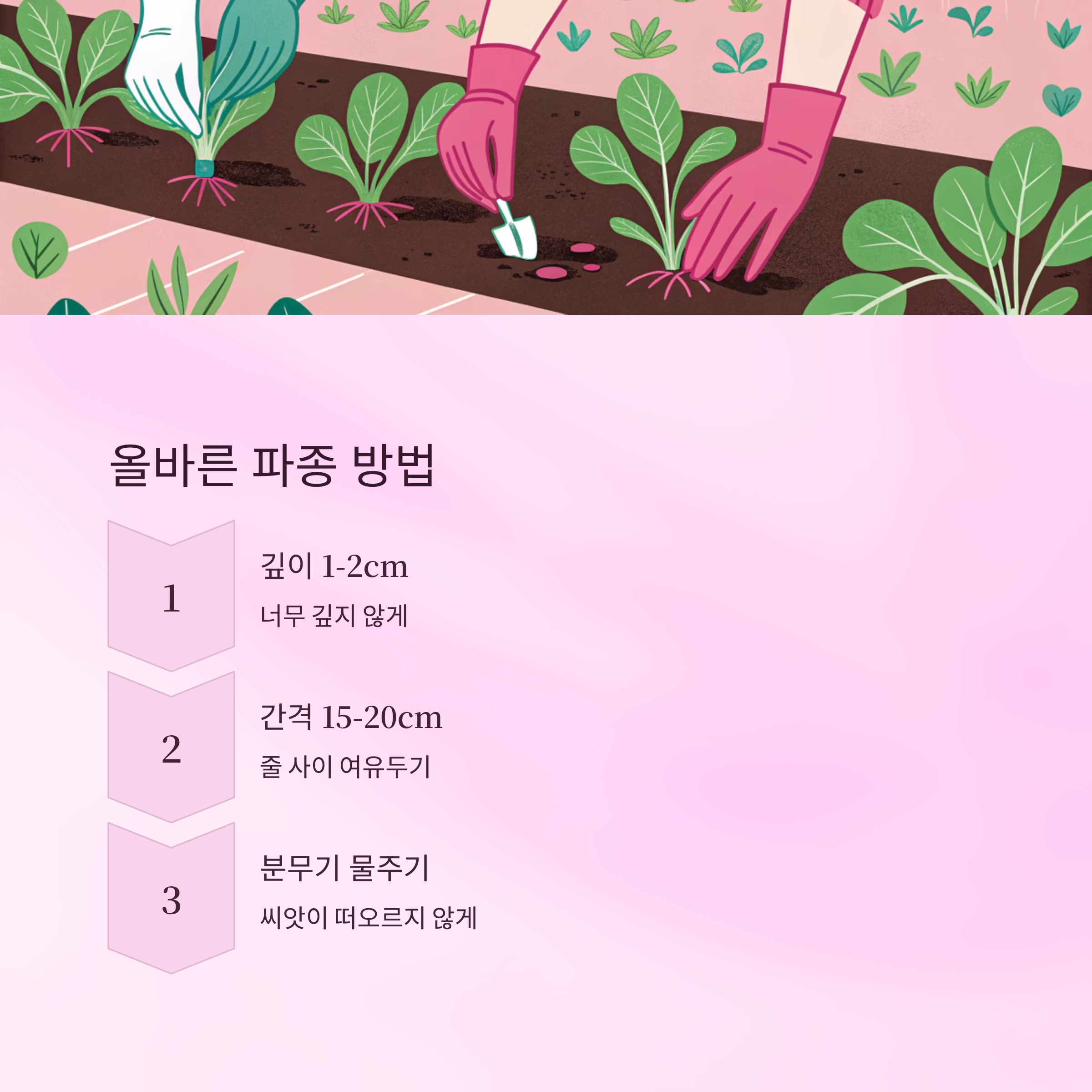| 씨앗 뿌리기 | 1~2cm 깊이, 줄 간격 15~20cm | 너무 얕거나 깊지 않게 |