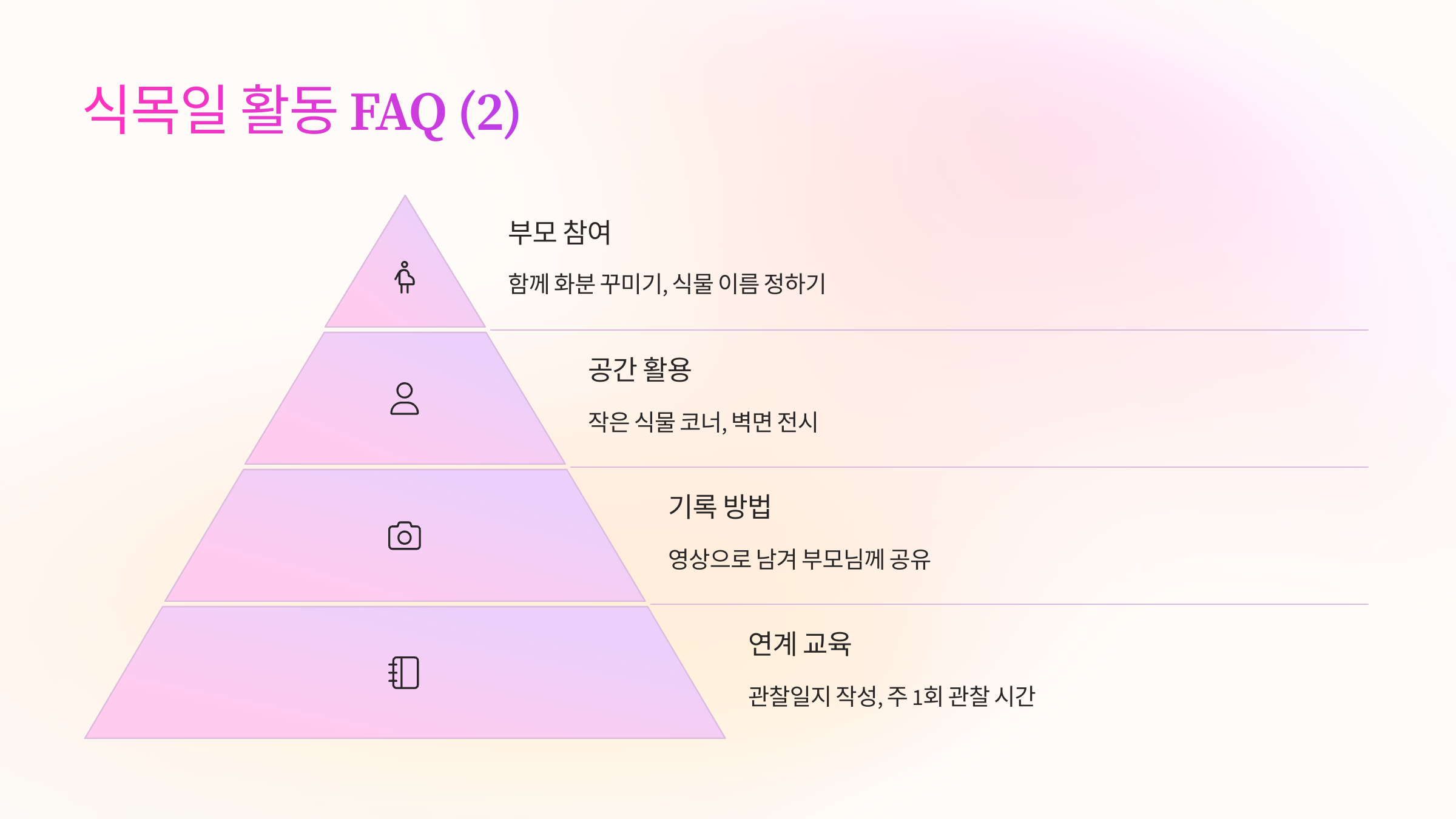 A1. 아이들이 자연과 생명의 소중함을 배우고, 정서적 안정과 책임감을 기를 수 있어요. 흙을 만지고 식물을 기르며 감각 발달과 호기심 자극에도 효과적이에요.