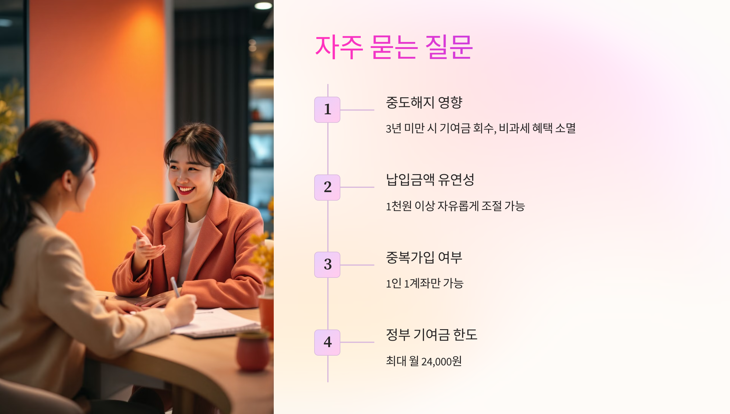 그리고 조건부로 ‘부분 인출’도 가능해요. 2년 이상 납입한 경우 원금의 최대 40%까지 인출할 수 있지만, 인출 시점에 따라 혜택 손실이 생길 수 있으니 신중하게 판단해야 해요.