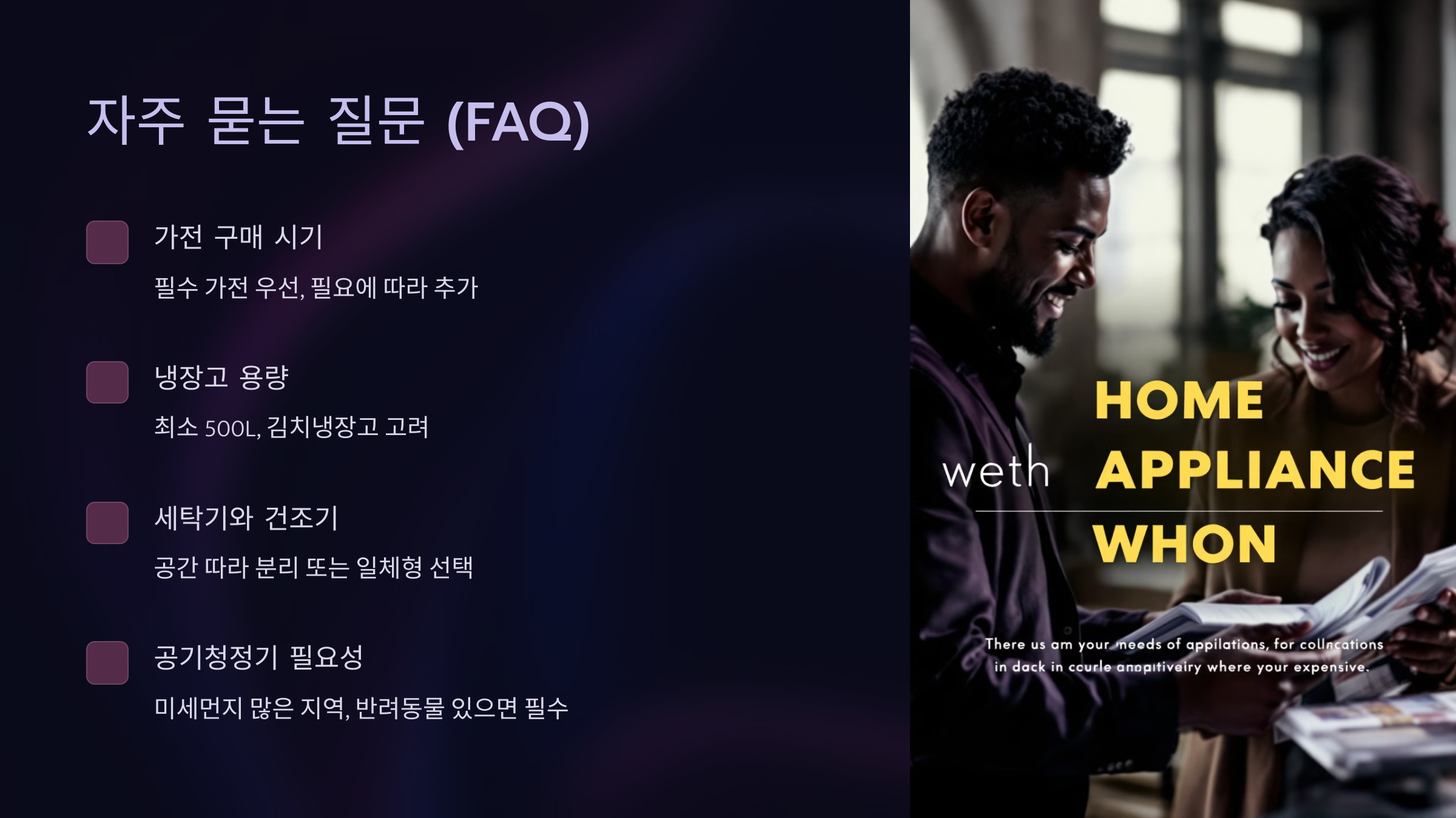 A1. 필수 가전부터 우선 구매하고, 생활하면서 필요에 따라 추가하는 것이 좋아요. 초기 비용 부담을 줄이면서 꼭 필요한 제품을 선택할 수 있어요.