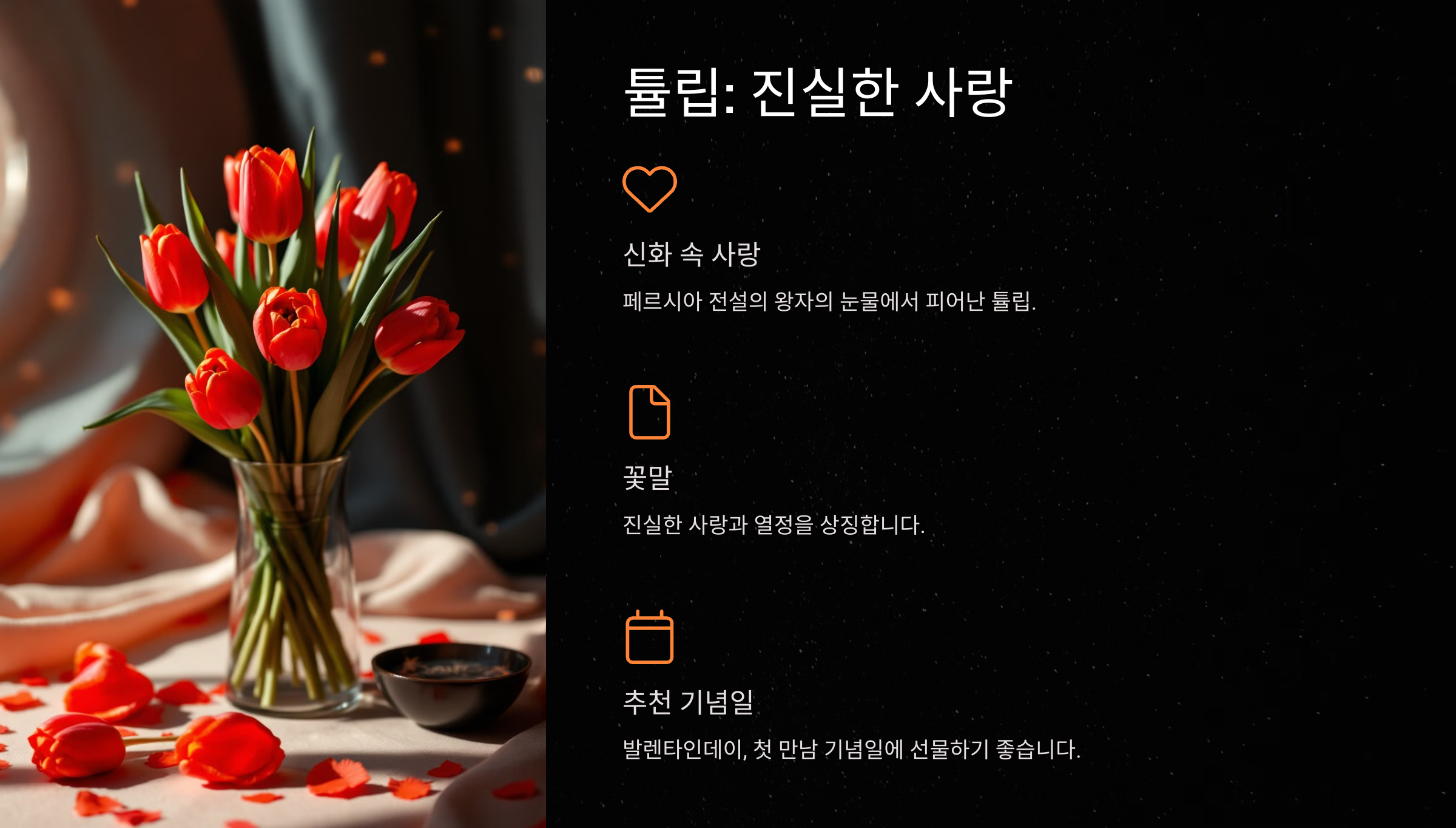 - 선물 아이디어: 빨간 튤립으로 부케를 만들어 진실한 사랑의 마음을 전해보세요. "당신은 나의 전부예요"라는 메시지를 담기에 딱이랍니다. 🌷
