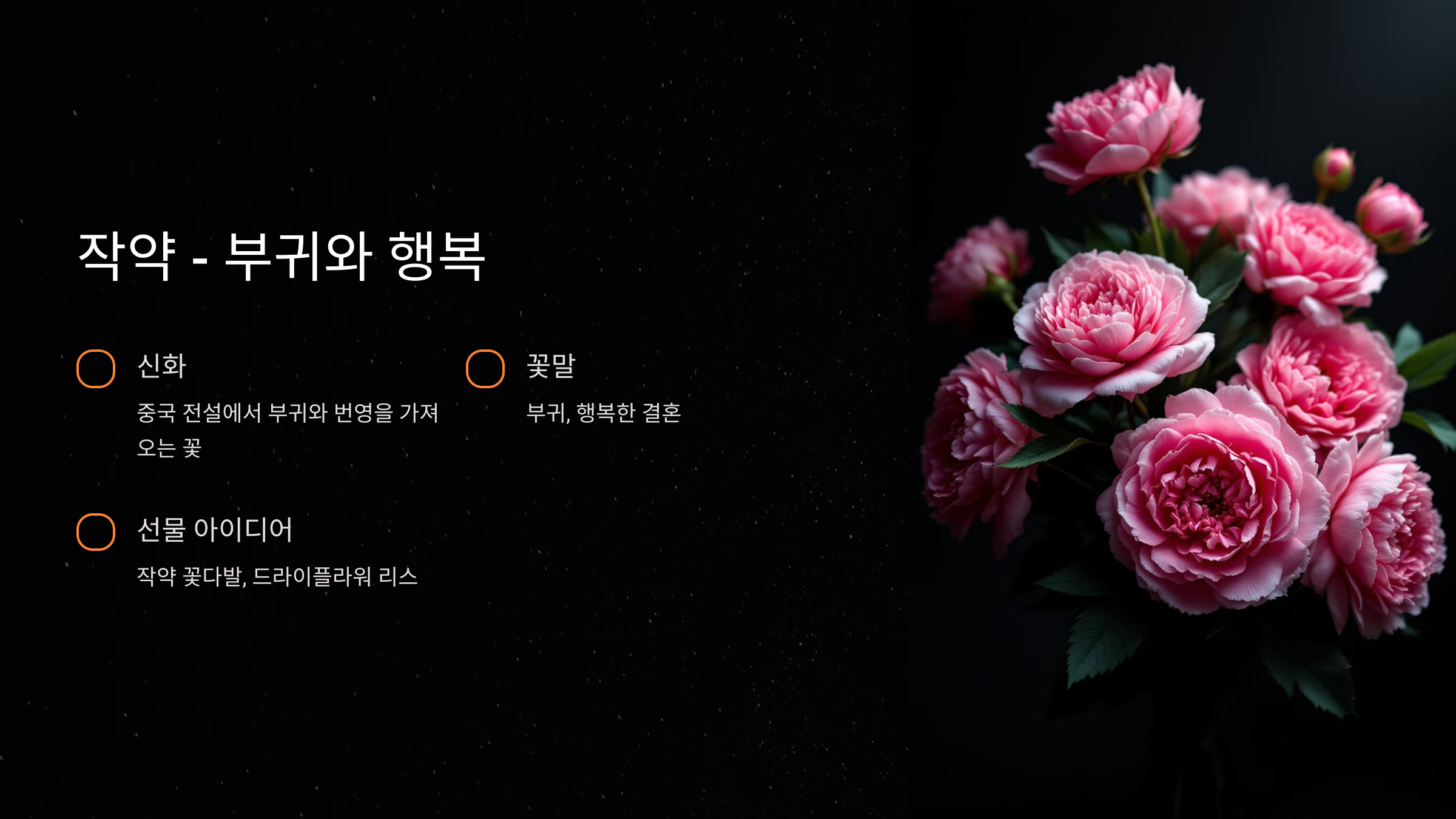 - 꽃말: 부귀, 행복한 결혼