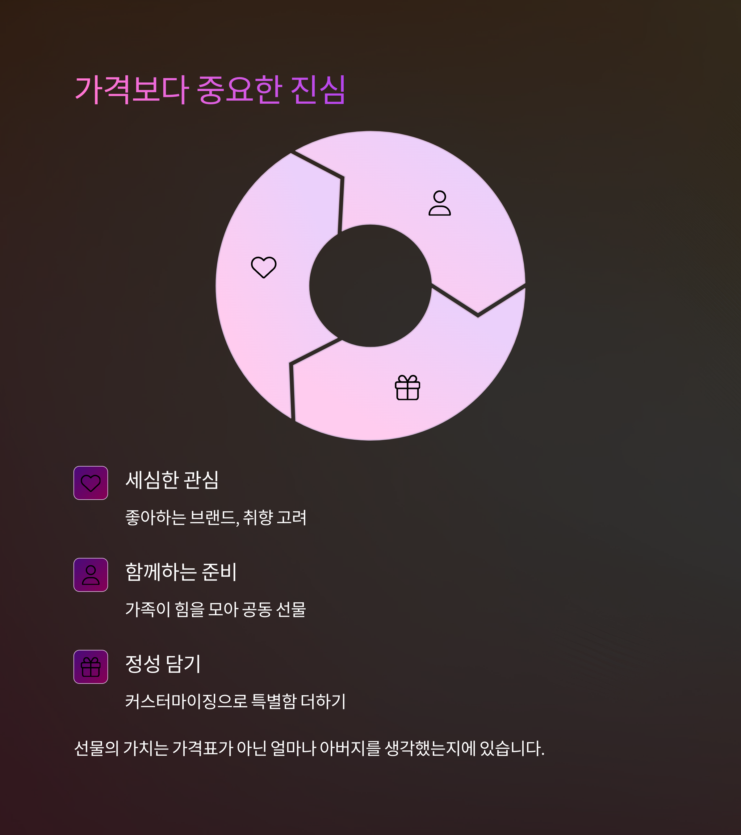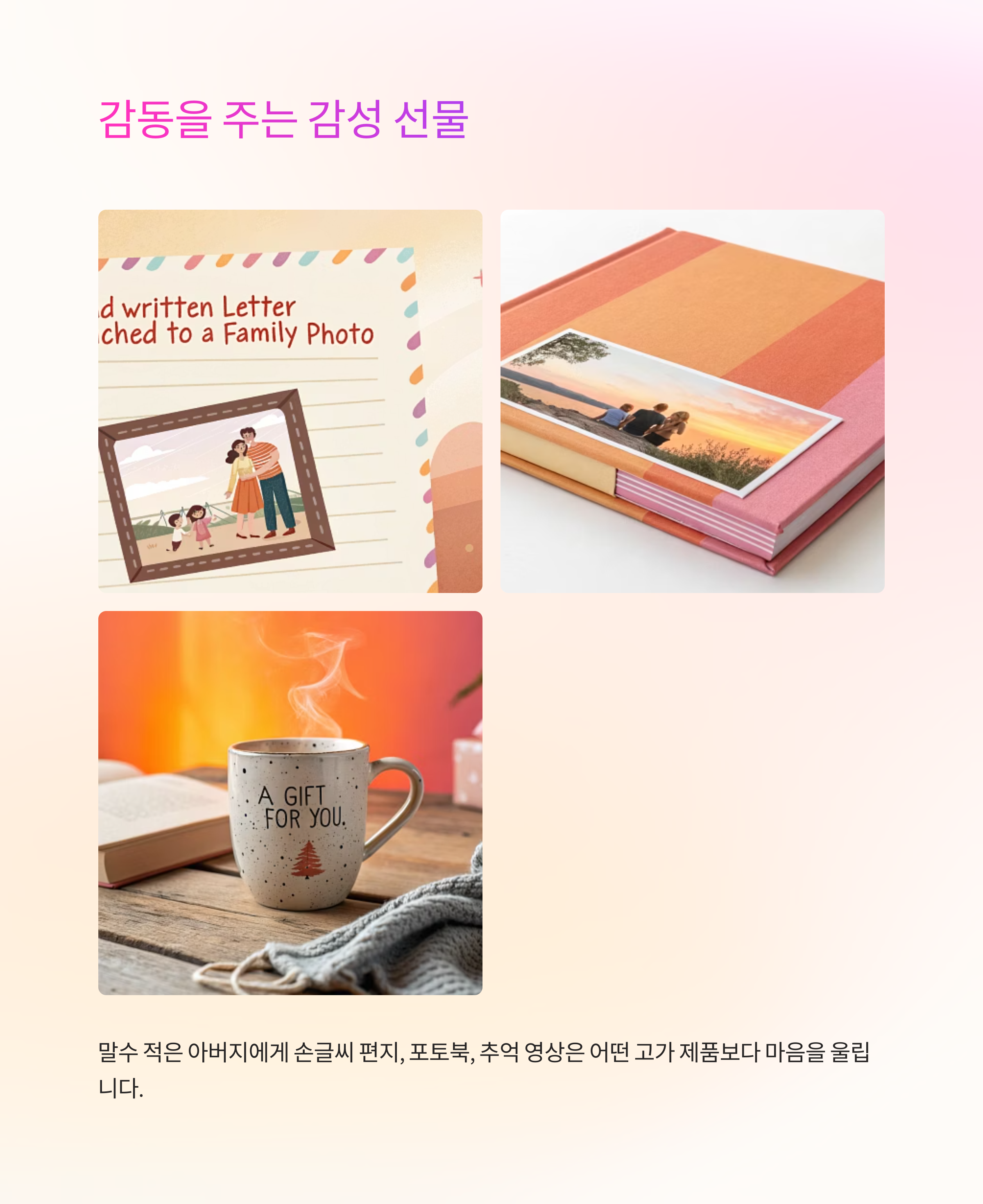 아버지에게는 '고맙다'는 말을 받는 것도 큰 기쁨이에요. 감성 선물은 오랫동안 입에 담지 못했던 그 말을 대신해주는 다리 같은 존재예요. 누구나 할 수 있지만, 아무나 하지 않는 진심의 표현이죠. 🎀