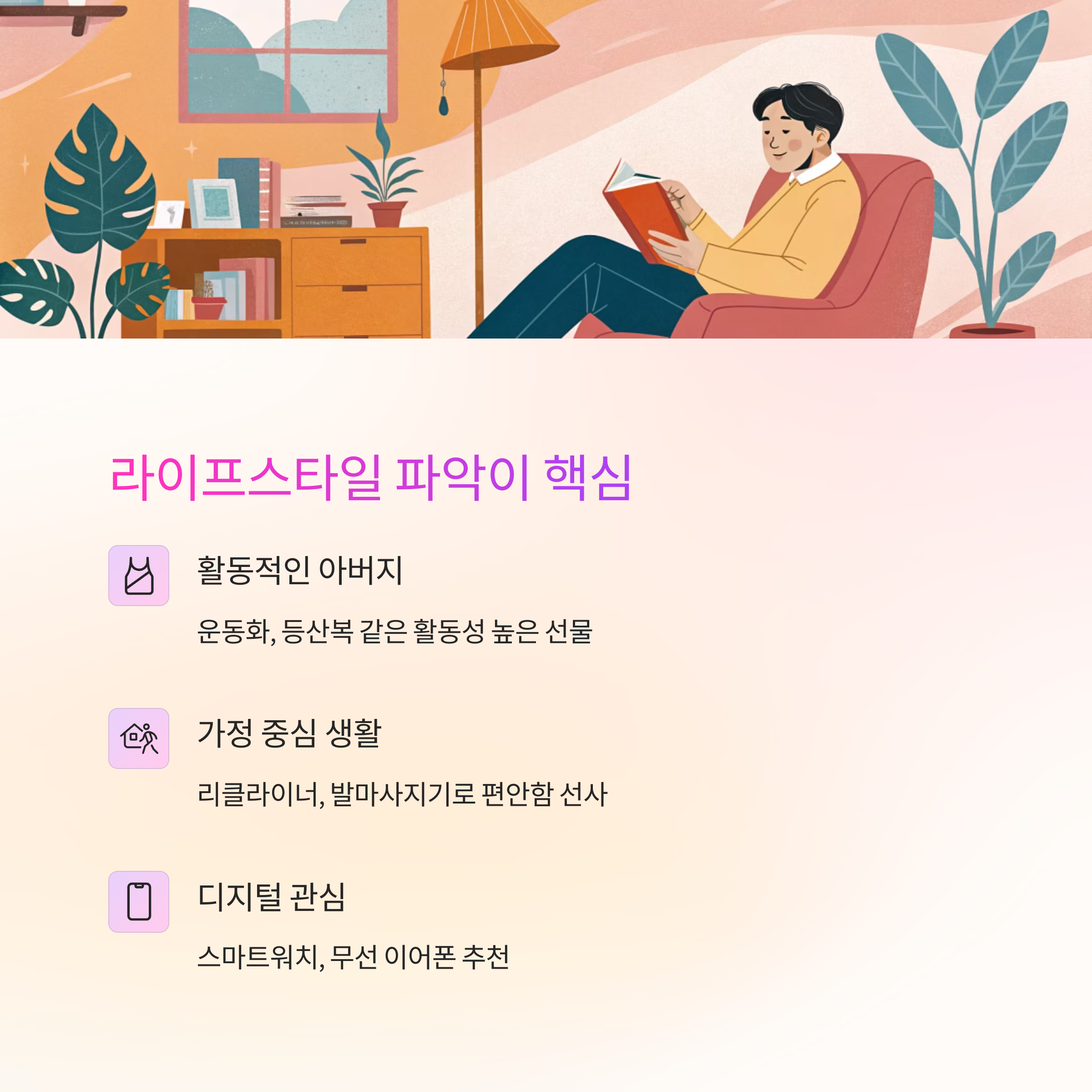 | 활동적인 아버지 | 운동화, 등산 스틱 | 실외 활동에 적합 |