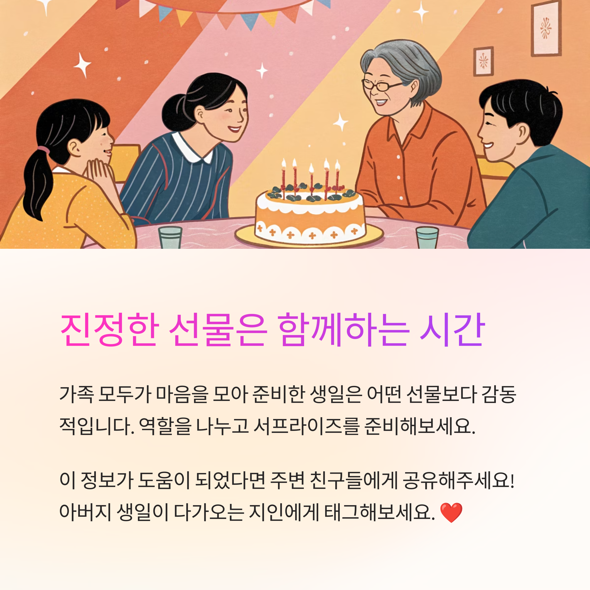 이렇게 온 가족이 힘을 합쳐 준비한 생일은 어떤 선물보다 감동적이에요. 정성과 마음이 가득 담긴 하루는 아버지의 가슴에 오래도록 남아 있을 거예요. 🎂
