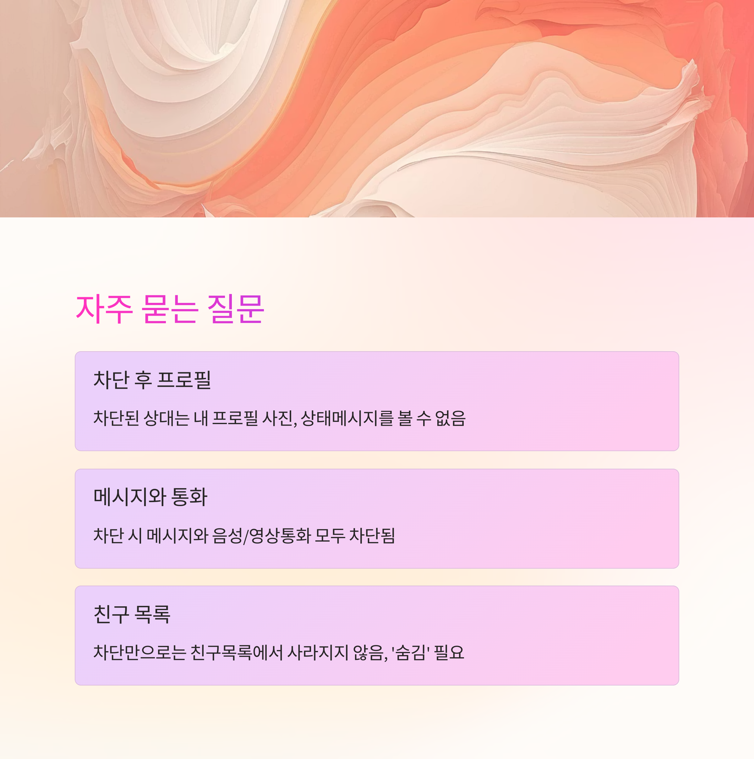 또한, 광고성 메시지를 반복해서 보내는 비즈니스 계정도 차단 가능해요. 그 계정을 단순히 숨기는 것보다는 차단하는 게 내 정보 보호에 효과적이에요. 특히 ‘상태 메시지’나 ‘배경음악’을 민감하게 생각하는 분들은 꼭 활용하세요.