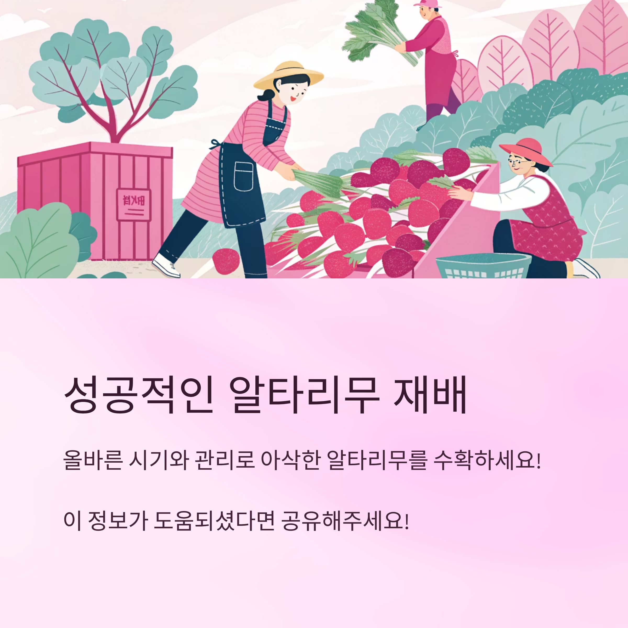 📌 면책조항: 본 글은 알타리무 재배에 대한 일반적 정보를 제공하는 목적으로 작성되었으며, 실제 재배 결과는 지역, 날씨, 토양 등 다양한 변수에 따라 달라질 수 있어요. 재배 전 전문 농업 컨설팅 또는 지역 농업기술센터의 자문을 참고하는 것을 권장해요.