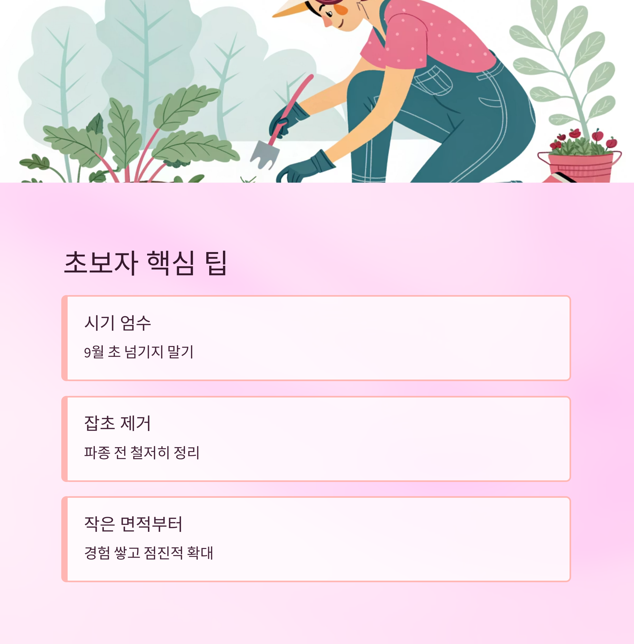 초보자는 작은 면적부터 시작해보는 게 좋아요. 알타리무는 빠르게 수확 가능하니까, 한두 줄 심어서 성공의 경험을 쌓은 뒤 점점 늘리는 방식이 좋아요. 물주기와 솎음 시기만 잘 기억해도 절반은 성공한 셈이랍니다!