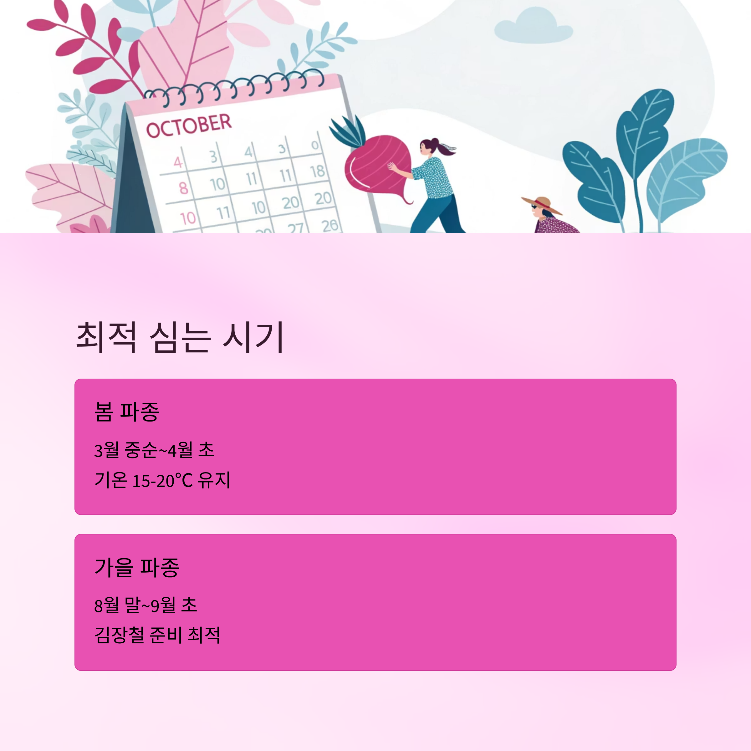 ‘내가 생각했을 때’ 알타리무는 봄이나 가을 중 기온이 크게 변하지 않는 시기가 딱 좋아요. 심는 시기와 기온, 토양 조건이 맞아야 제대로 된 알타리무를 수확할 수 있으니까요. 지금부터는 언제, 어떻게 심고 어떻게 키워야 하는지를 하나하나 소개해볼게요. 놓치지 말고 끝까지 따라와 주세요! 🌱